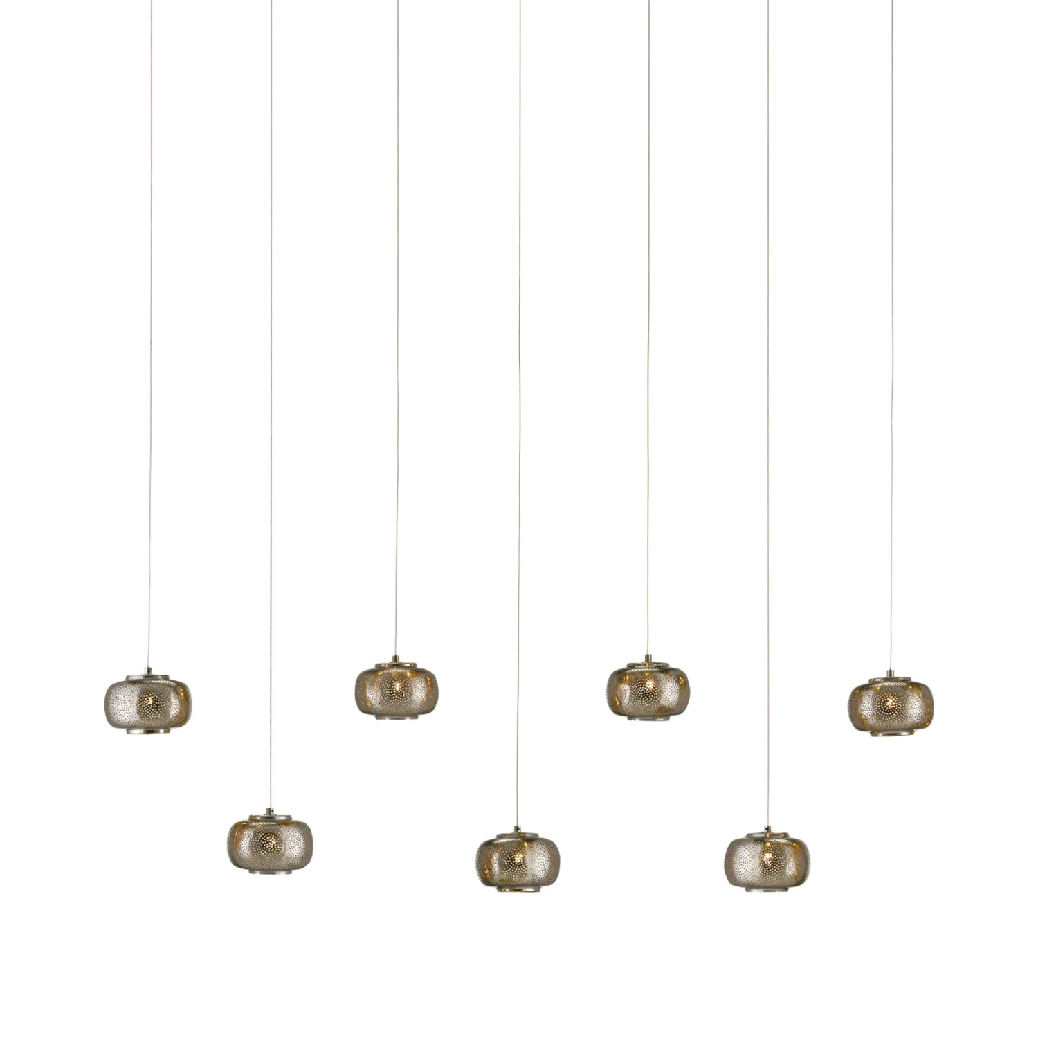 A delightful cluster of lights indulges a love of chic organic artistry as the Pepper Linear Multi Pendant Light from Currey and Company adds a playful look with plenty of customization options. Dangling shade elements fashioned of nickel finish wrought iron deliver simple and subtle style as they emit soft illumination over an island or any horizontally oriented venue. A lush painted silver finish metal canopy plays a prominent design role.