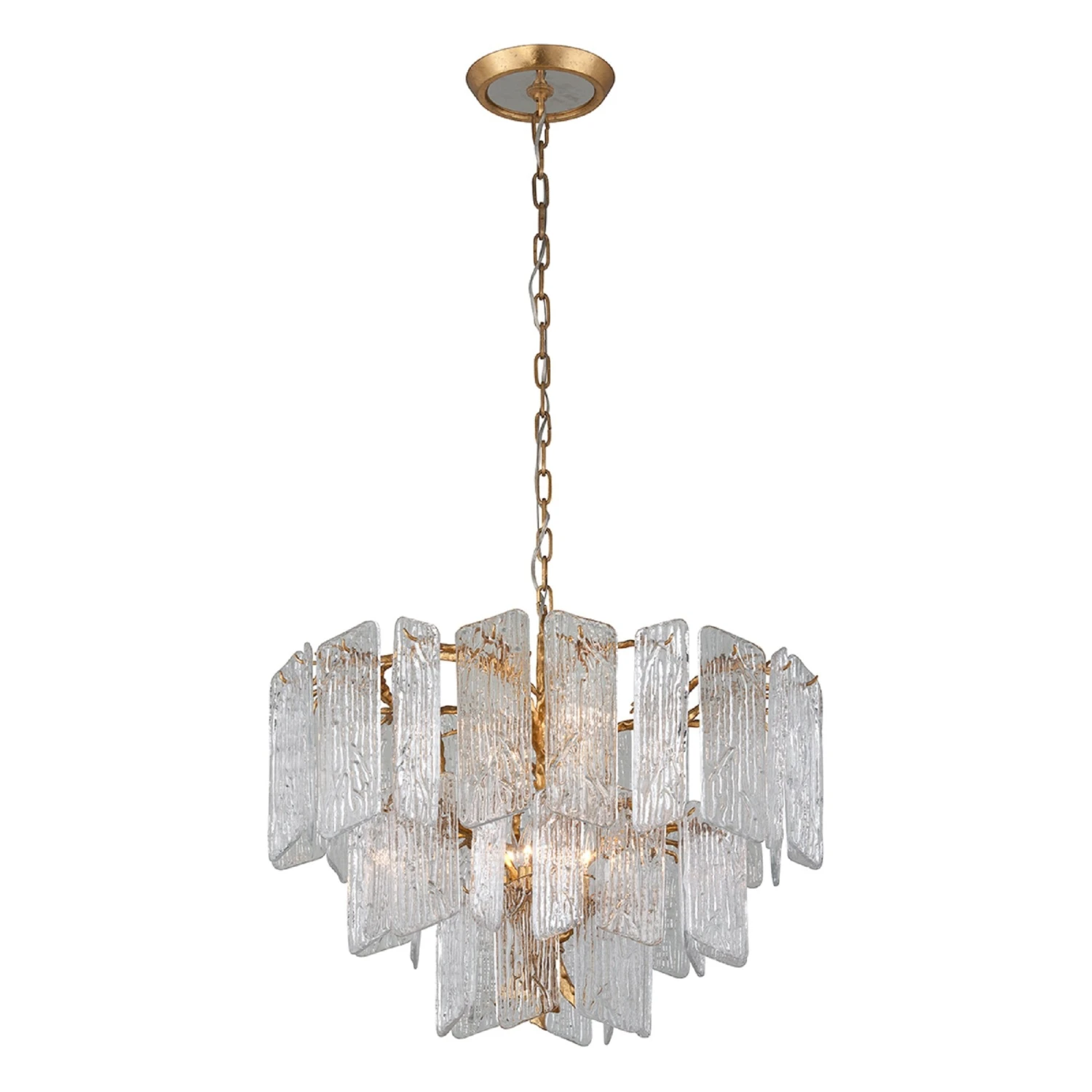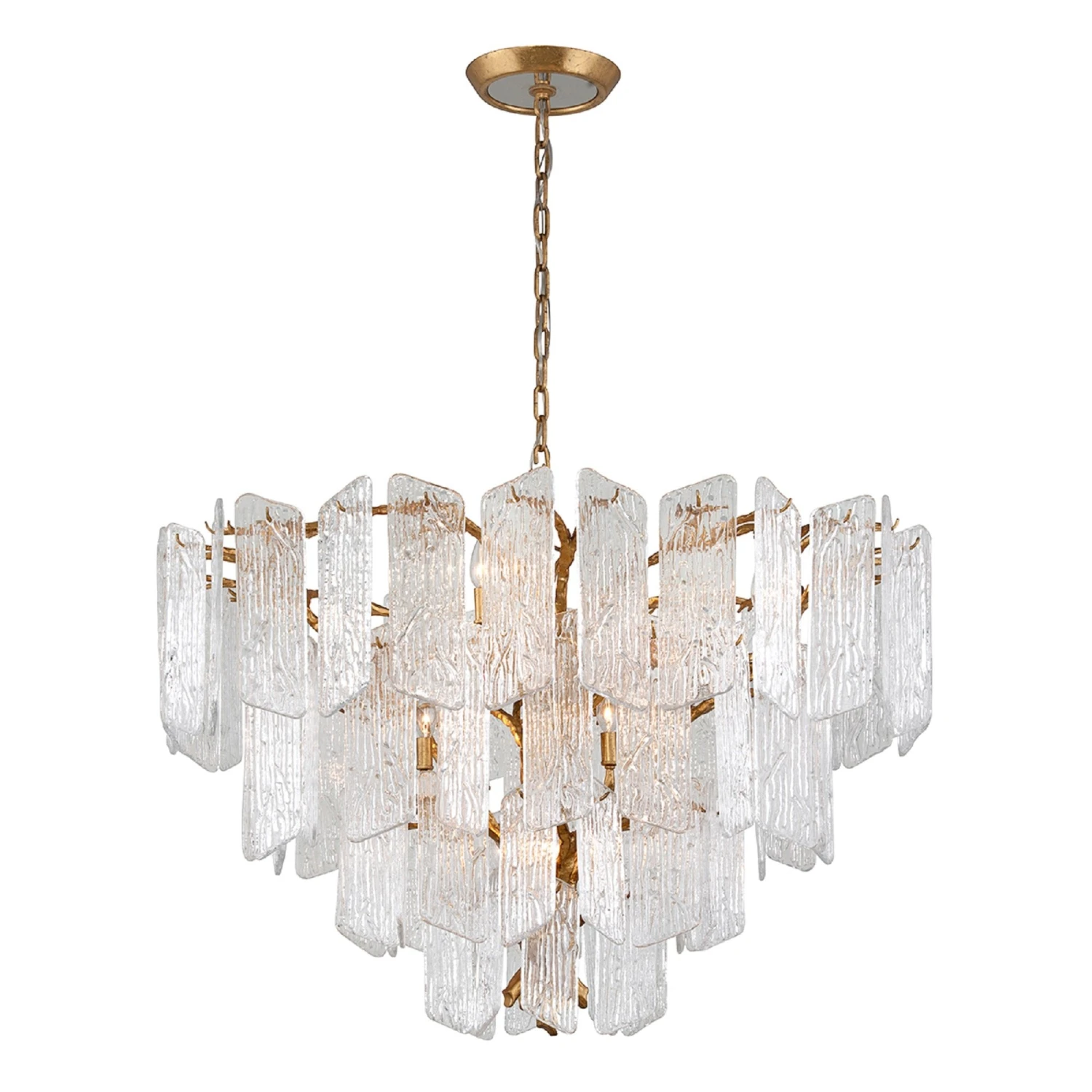 Glam-influenced design elements and materials converge in the Piemonte Chandelier from Corbett Lighting, offering decadence with surprisingly casual attitude and a blend of hand-made clear glass strips attached to an interior frame made of lush royal gold metal.