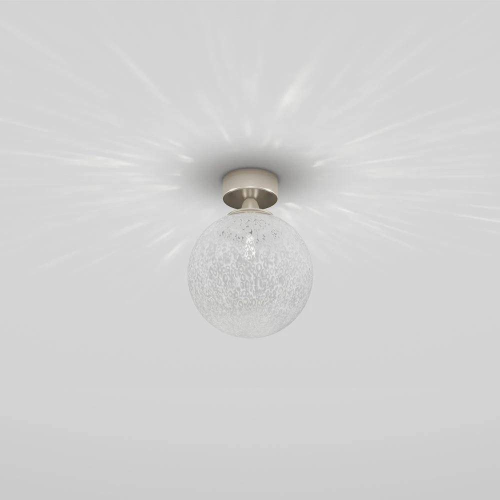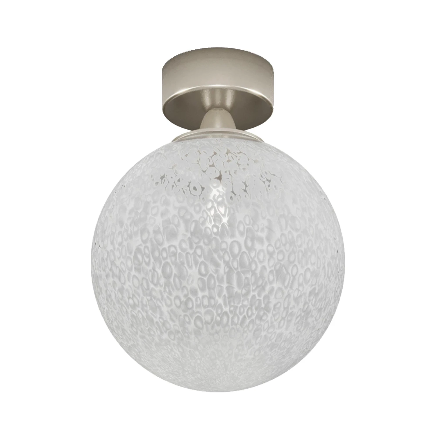 Minimalism borrows a bit of retro influence in the design of a light fixture destined for impact. Offering an exotic aged look with white murrina glass, the Rina Spot Light from Vistosi becomes an integral part of illumination in any space. A gleaming metal canopy supports the festive spherical glass shade, adding to the overall elegance of a sophisticated style scheme.