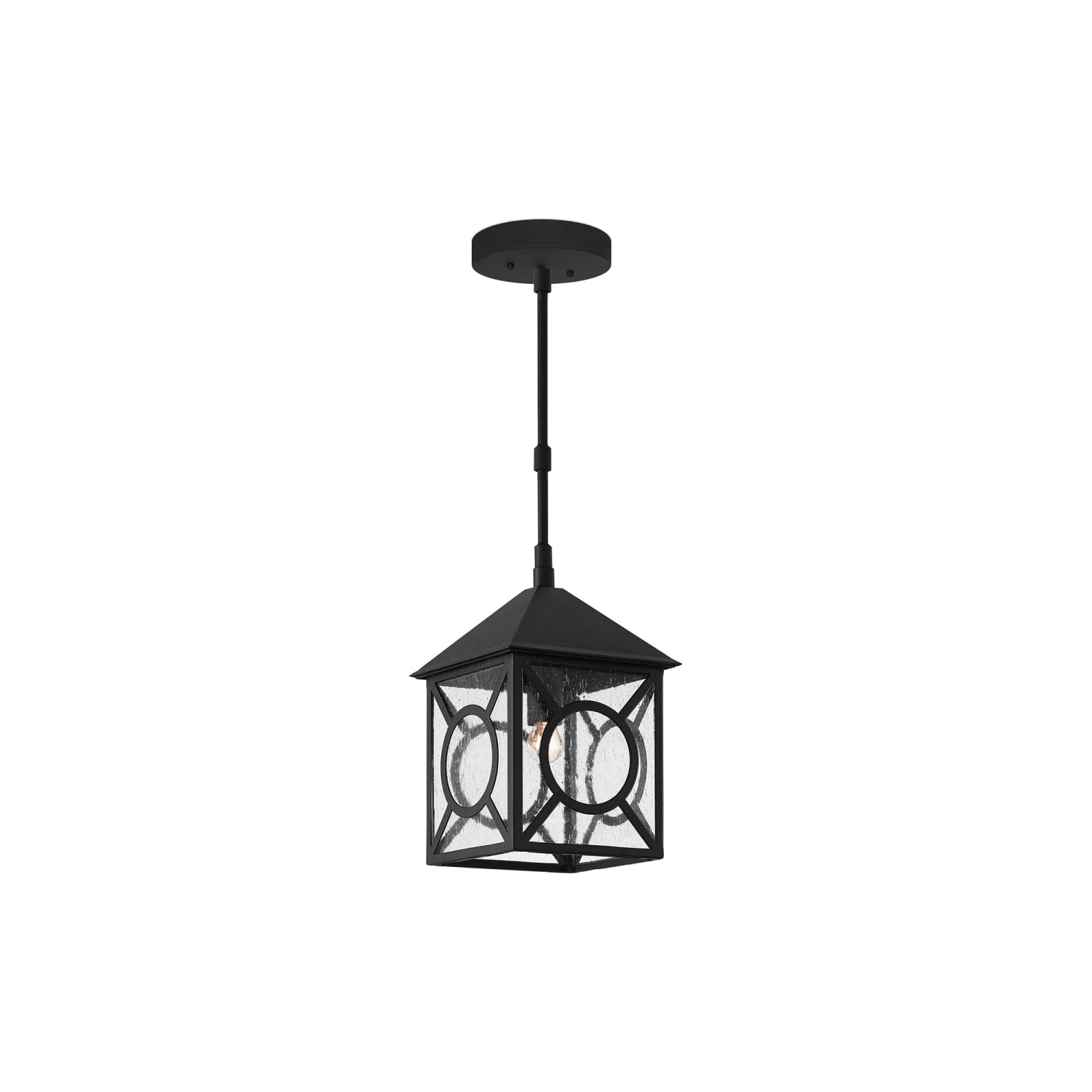 Showing off the dynamic look of conventional style, the Ripley Outdoor Pendant Light from Currey and Company puts its emphasis on detail and a busy configuration. Midnight black wrought iron constructs a lantern-like rectangle frame with ornate geometric accents, with clear seeded glass protecting a single interior light socket. A roof top finishes this fixture’s tasteful aesthetic, ideal for porches, outside bars, and gazebo settings.