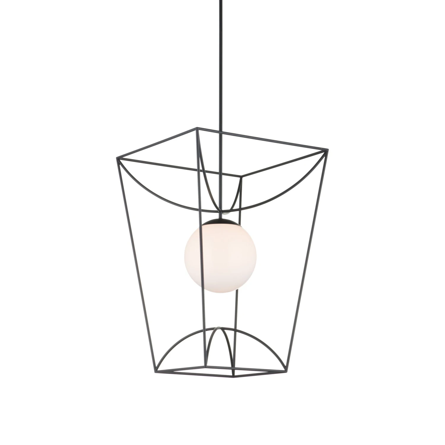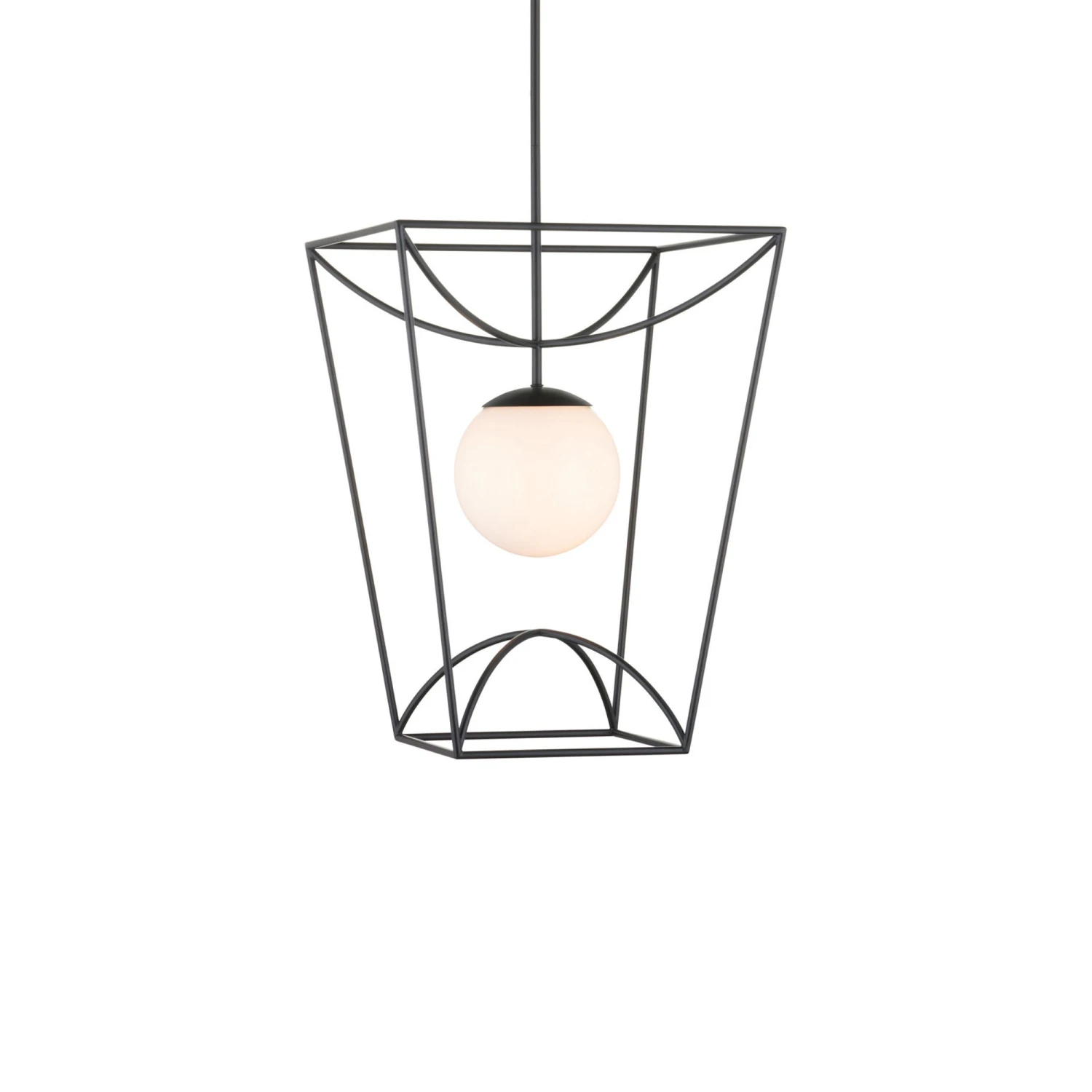 A festive openwork metal design with lantern-like silhouetting dresses up exterior entertaining spaces with style. The Rochefort Outdoor Pendant Light from Currey and Company offers a tapered black metal silhouette with curvy accents and a whimsical milky white glass globe. Its notable mix of old and new offers obviously timeless appeal.