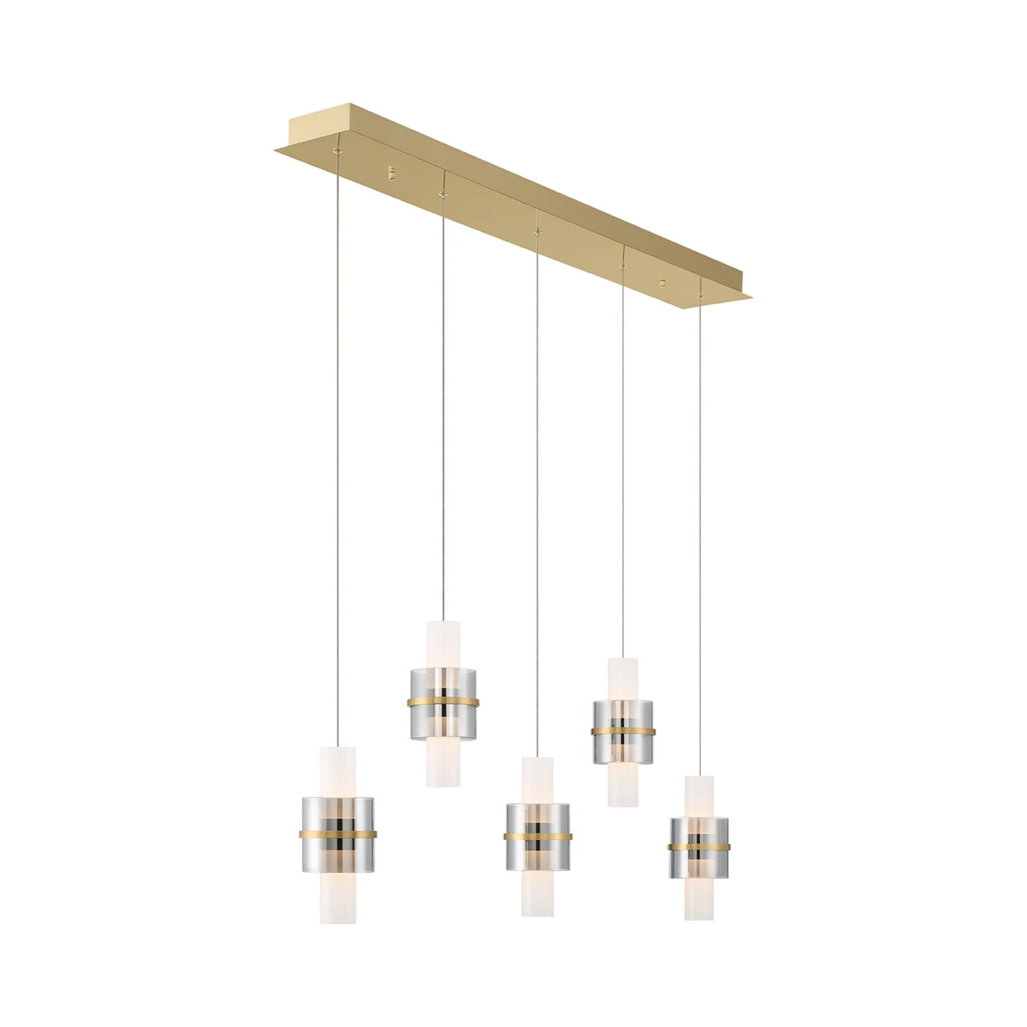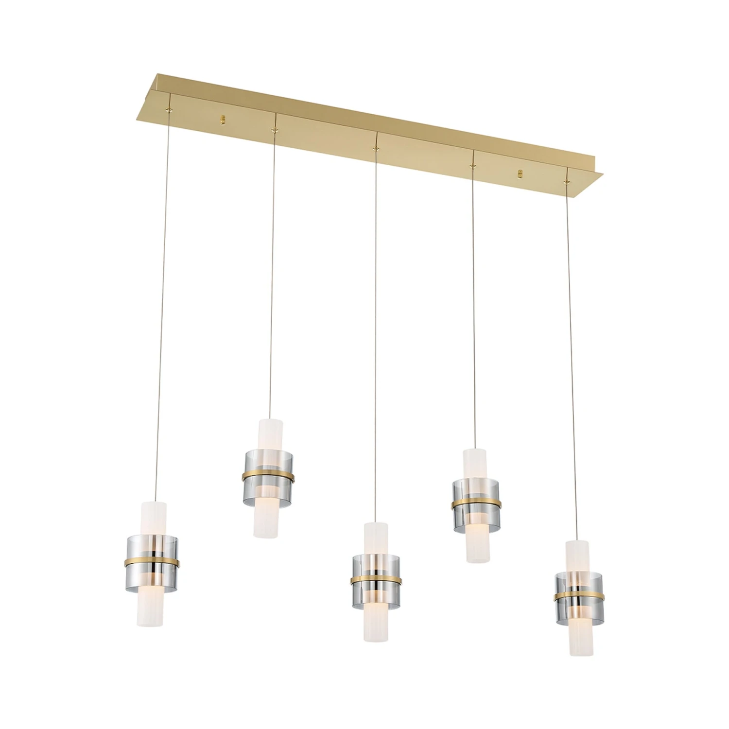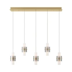 Capture an artisan look with appropriate delicacy in the Rola LED Multi Light Pendant Light from Eurofase. Dangling banded smoke glass elements center illuminated energy-efficient white acrylic cylinders, all arranged in alternating lengths. Lush brushed gold metal accents and a matching linear canopy infuse targeted warmth along with contrast, showcasing a custom kitchen island or entertaining space with notable charm.