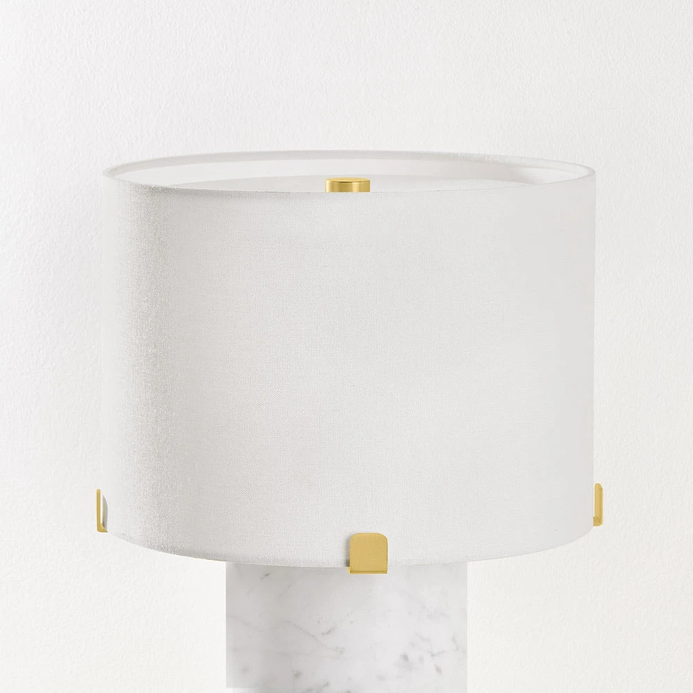 Stylish detail embellishes an already exotic and beautiful aesthetic in a lamp suited for exceptional spaces. The Rumi Table Lamp from Mitzi echoes bejeweled eloquence with a Carrara marble base and linen drum shade. Metal accents clip to its shade.