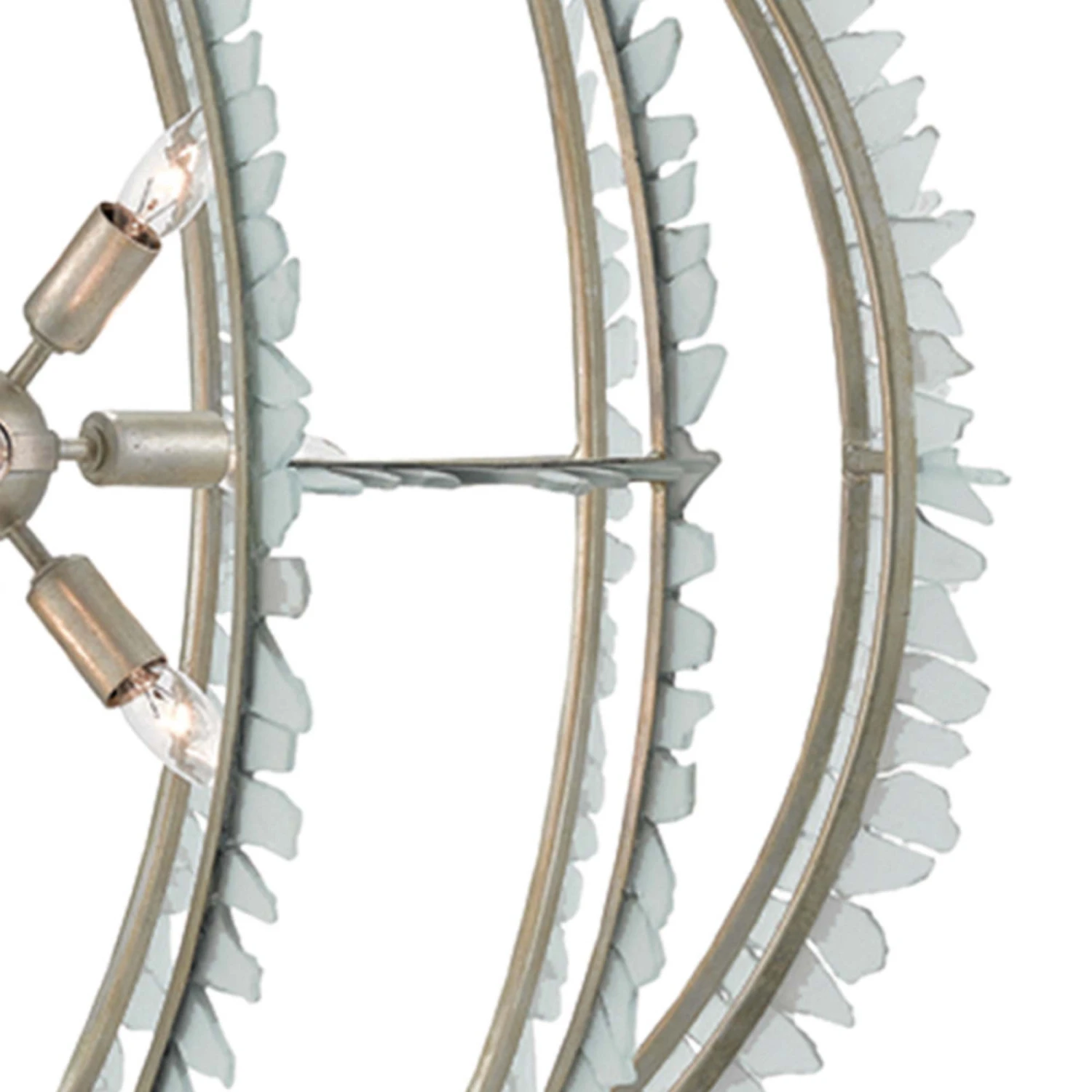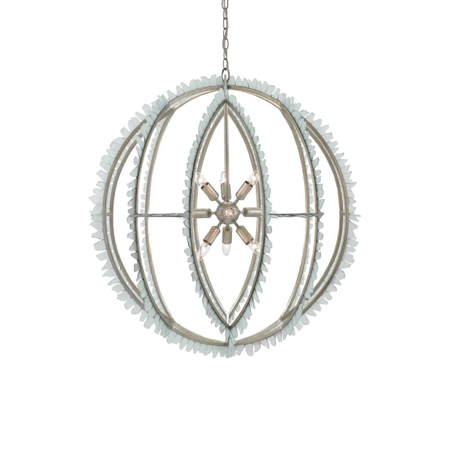 The motif is edgy, artisan, and inspired as the Saltwater Chandelier from Currey and Company adds a new twist in lighting décor. Natural elements lean coastal in an openwork wrought iron frame with a silver leaf finish, intersecting and layering with varying shapes. Glass chip elements create a fringe-like look with a pale aqua tint, with a charming light mount arranged in a radial pattern is both decorative and effective in emitting illumination in all directions.
