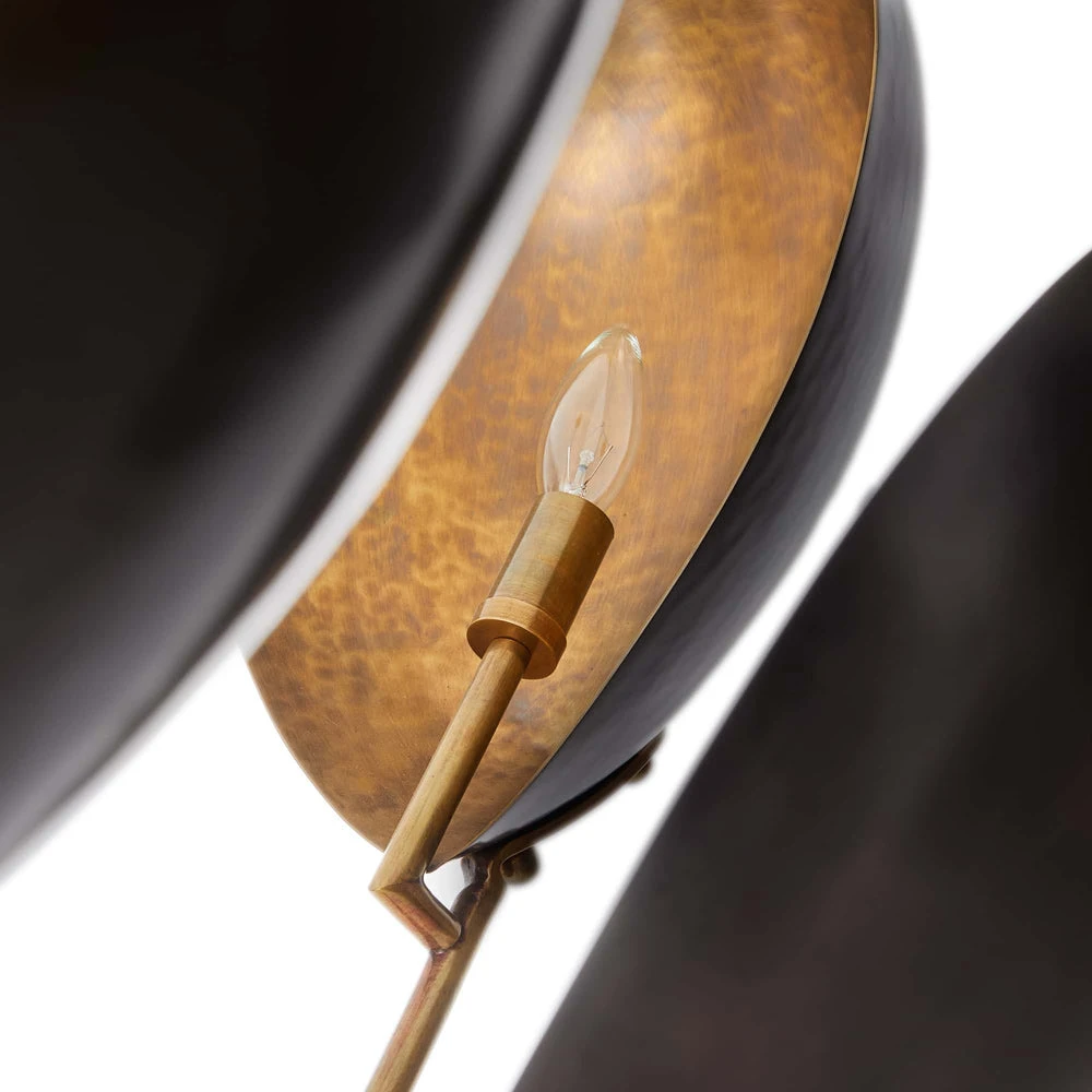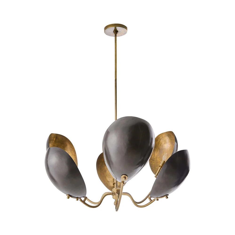 A sculptural version of Art Deco stands as a central design theme as the Savo Chandelier from Arteriors provides an eye-catching look in modern or transitional spaces. Shell shaped shades fashioned of bronze brass are embellished with rich gold interiors that are easily visible. Antique brass framing features gently curved arms and a pipe stem.