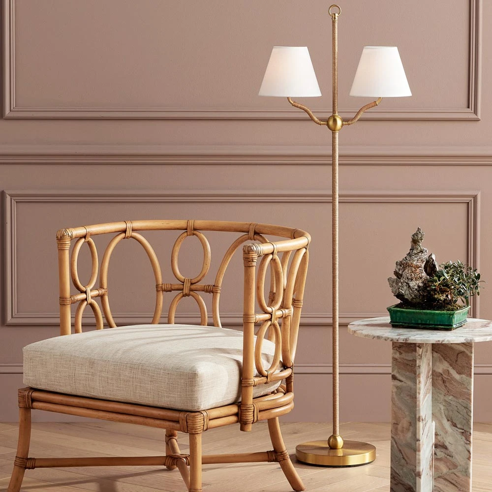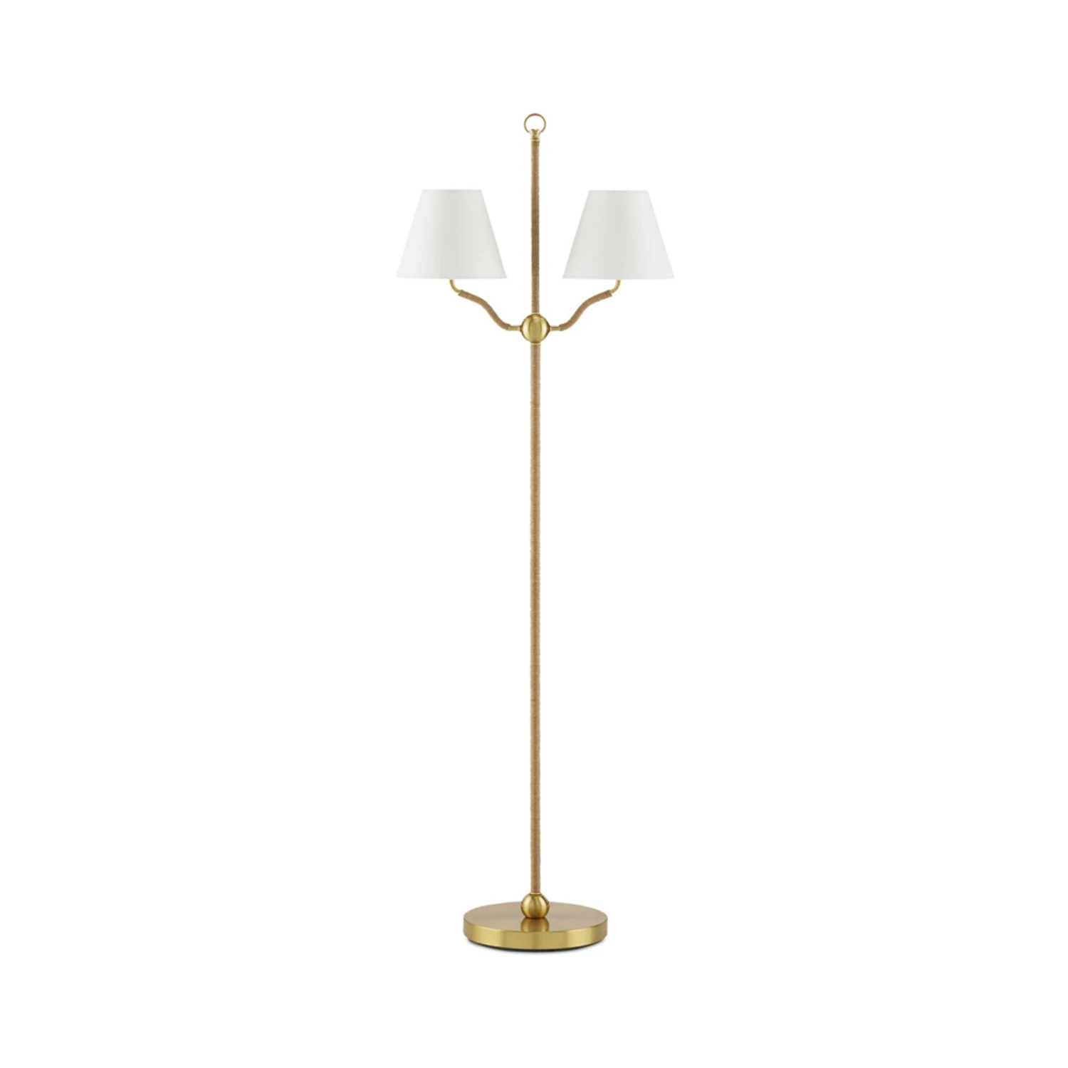 Weave organic influence into a chic design as the Sirocco Floor Lamp from Currey and Company adds soft, calming vibes. A neutral palette of antique brass and natural finishes enhances a double-shaded dual light design, with shades poised on gently curved arms and a straight stem wrapped in natural jute rope. A timeless aesthetic leans a bit rustic and exotic.