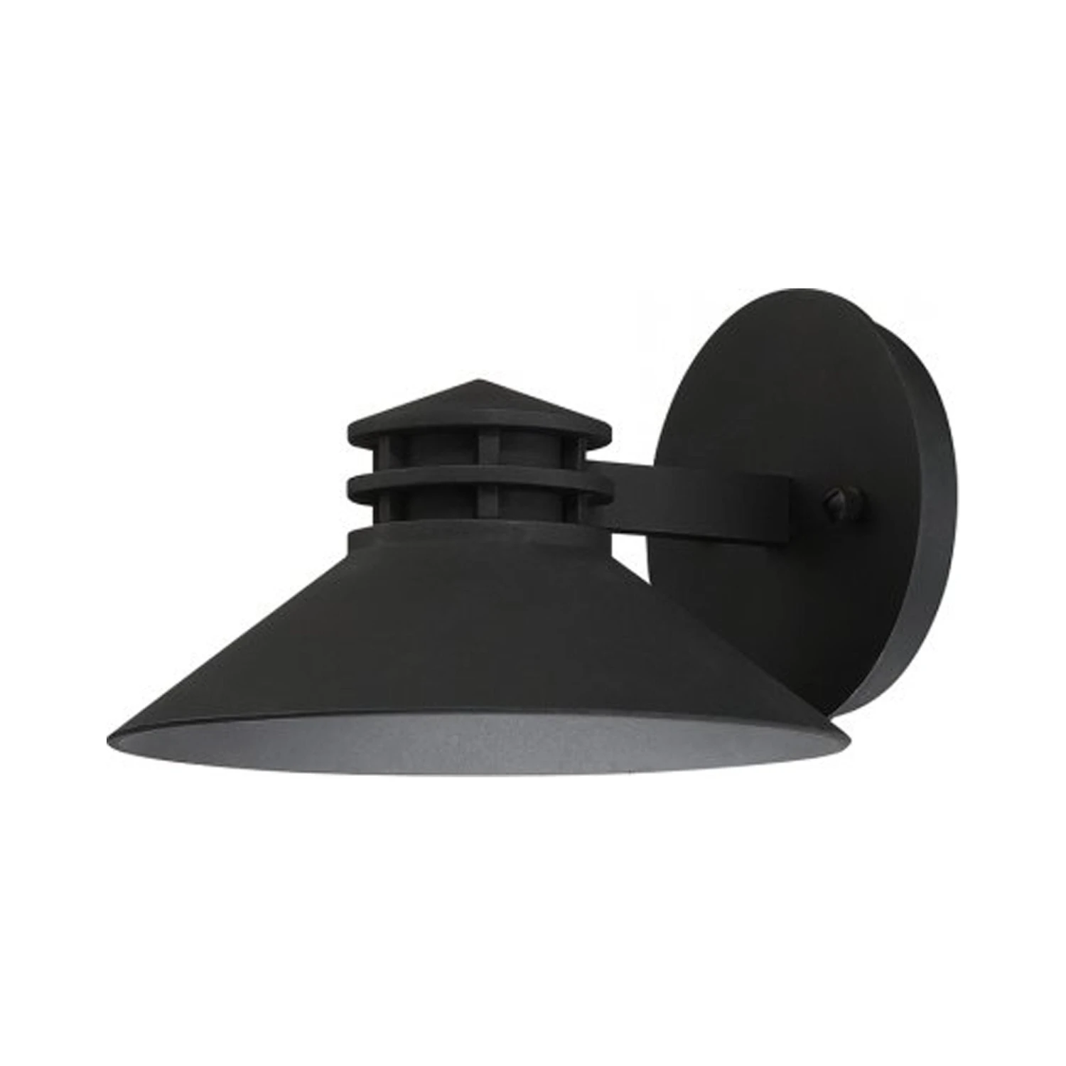 Storied industrial charm stylizes the Sodor Outdoor LED Wall light from dweLED, adding a rugged, bold lantern aesthetic with an aluminum shade and mount and a glass diffuser.