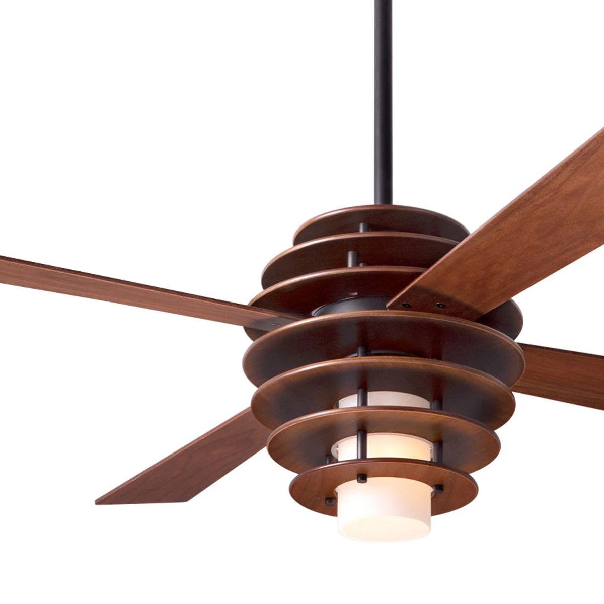 The Stella LED Ceiling Fan from Modern Fan Company captures an inspired exotic look, adding a touch of coastal influence. Four blades spin from an AC motor with a reverse switch to send warmer air downward, and a light kit infuses energy-efficient lighting. Made of die cast aluminum and stamped steel, its plywood veneer and steel posts deliver an artisan design that embellishes any space.