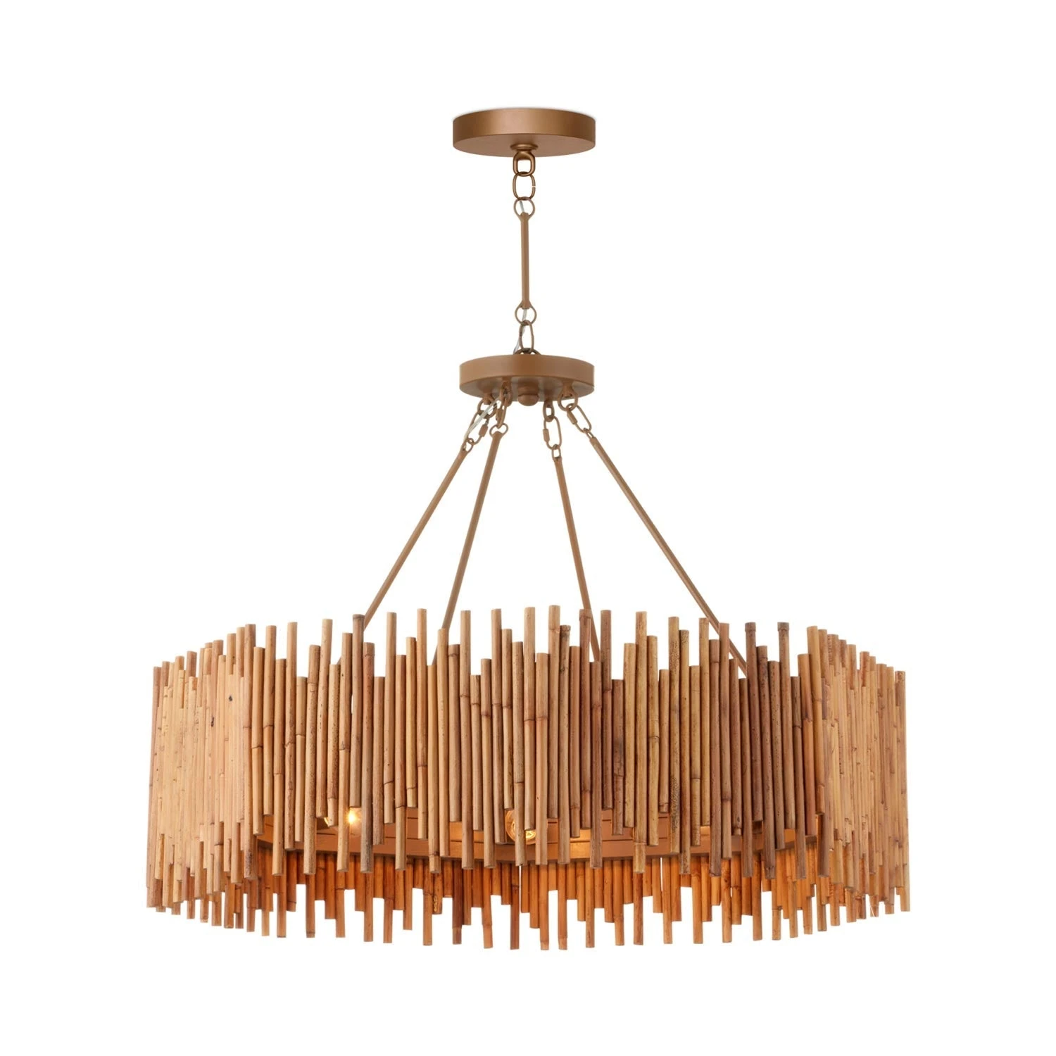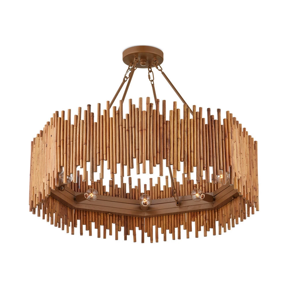 A bold iteration of exotic style, the Teahouse Chandelier from Currey and Company delivers a complement to casual décor. Rattan ribs of gradient lengths align to form a ring frame, with khaki finish metal hardware perfectly complementing its organic palette. Light seeps through slender frame spacing, delivering an impacting effect perfect for ambient lighting.