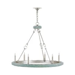 Embrace a hint of coastal fare with a light fixture focused on the power of simplicity. Seaglass chips coat the Tidewater Chandelier from Currey and Company by affixing to its ring frame constructed of silver granello finish wrought iron. Gleaming metal candle sleeves and nautical-inspired cable links provide all the personality needed to deliver a breezy look of elegance.