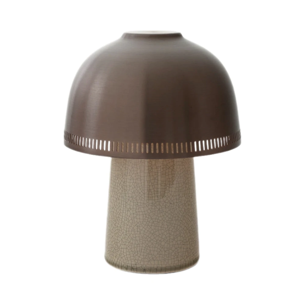 A scaled down size and nostalgic design mirrors Japanese artisan fare as the Raku SH8 Portable Table Lamp from &Tradition delivers a low-key visual statement with just the right level of illumination. Its mushroom-like silhouette and construction of hand-sculpted ceramic with a crackle glaze offsets a spun metal shade, offering an intriguing bit of drama to a portable light source.