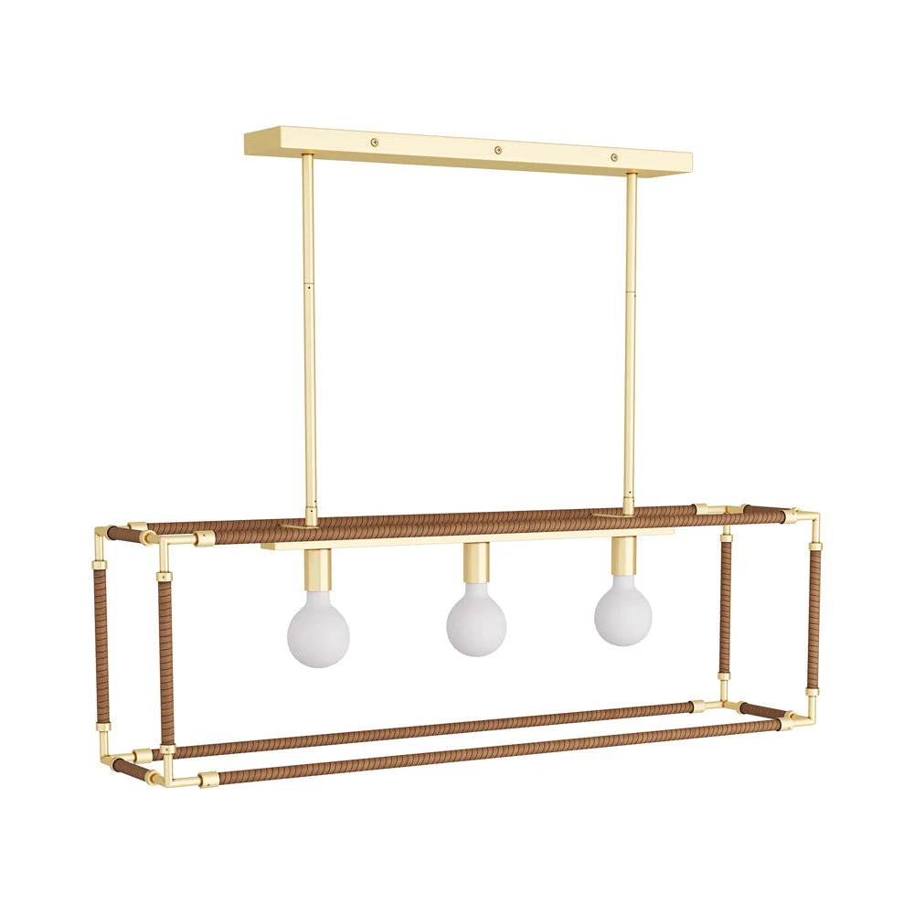 Open design concepts flatter a light fixture with both modern and transitional style as the Trenton Chandelier from Arteriors shapes a graceful linear presence, minimizing detail. An extended version of lantern-style lighting, its antique brass finish iron framing is embellished with cognac leather wrapping, adding a bit of texture. Three exposed bulbs use frosted glass to zero in on a decadent light fixture.
