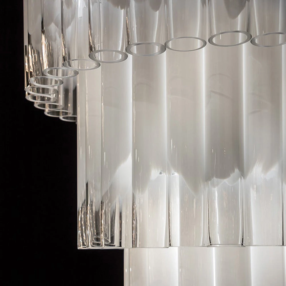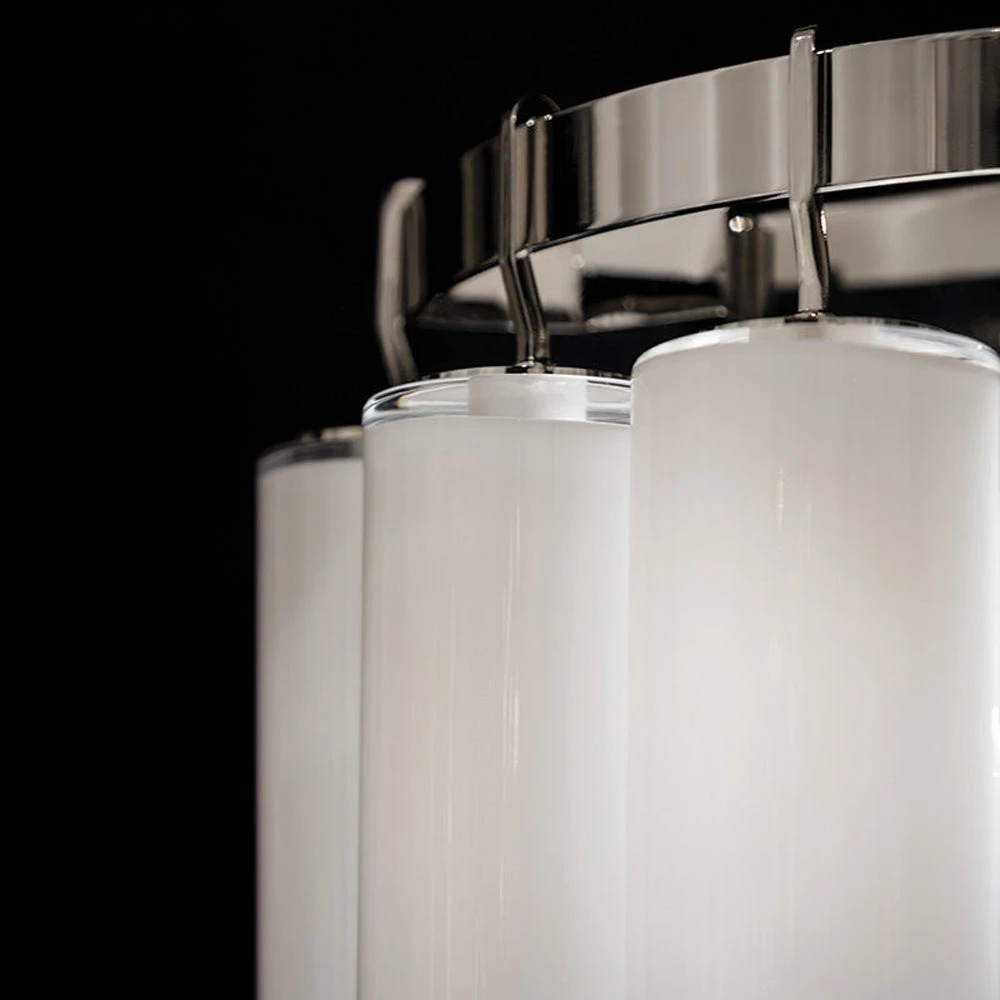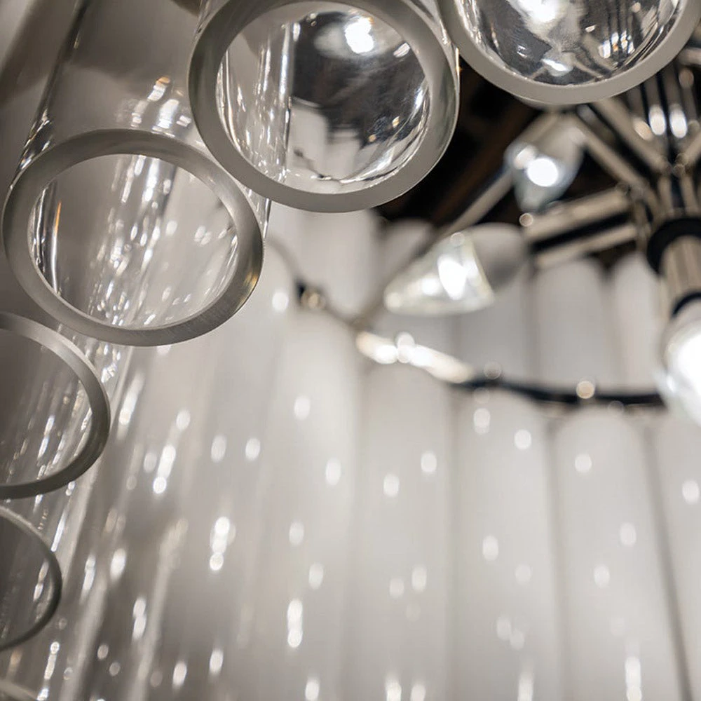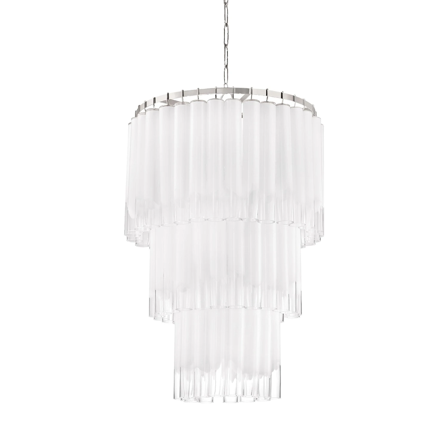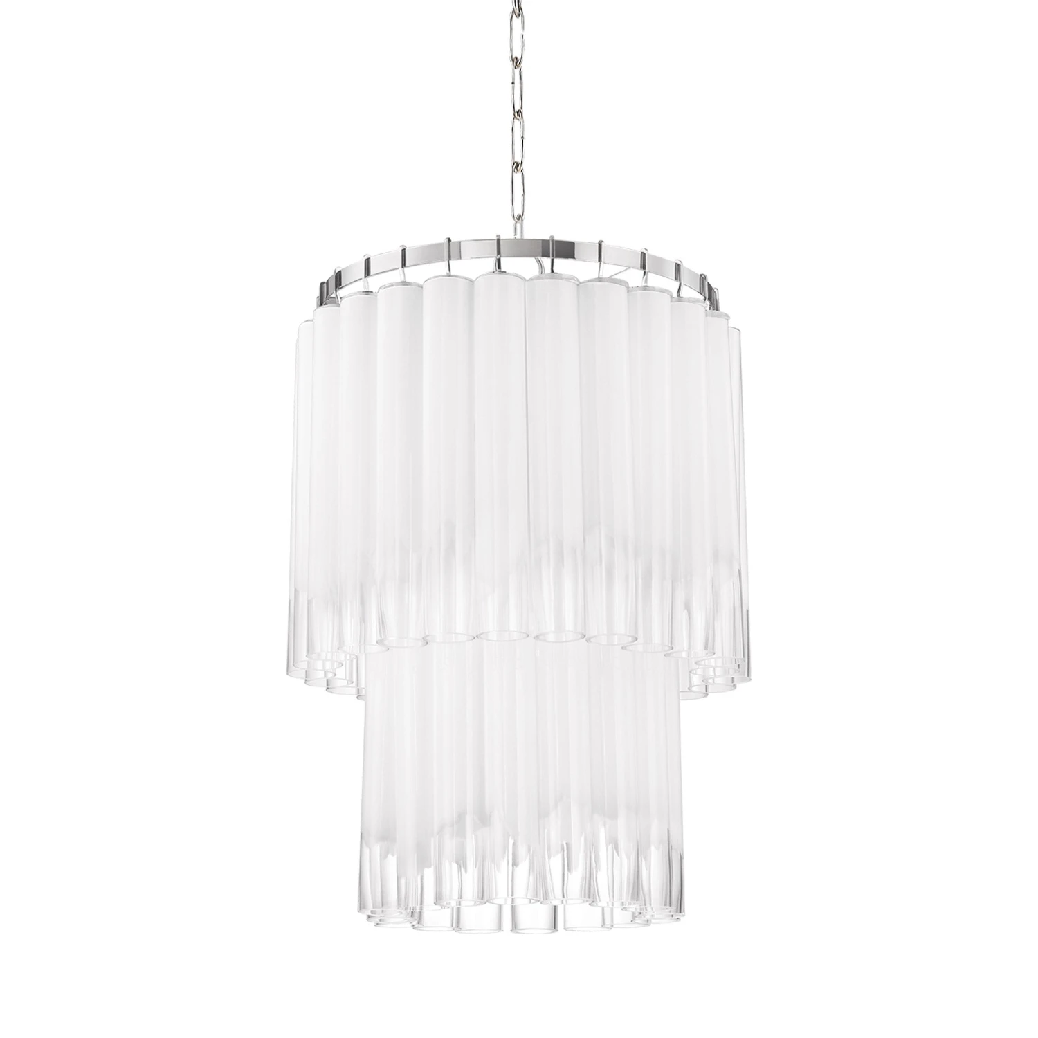 The simplicity of elegance shows up in the Tyrell Chandelier from Hudson Valley Lighting. Dangling tiers of clear and white finish glass tubes, offering a version of the classic waterfall. Gorgeous polished nickel finish metal in a ring frame and suspension chain lifts the glam look of a light you’ll love.