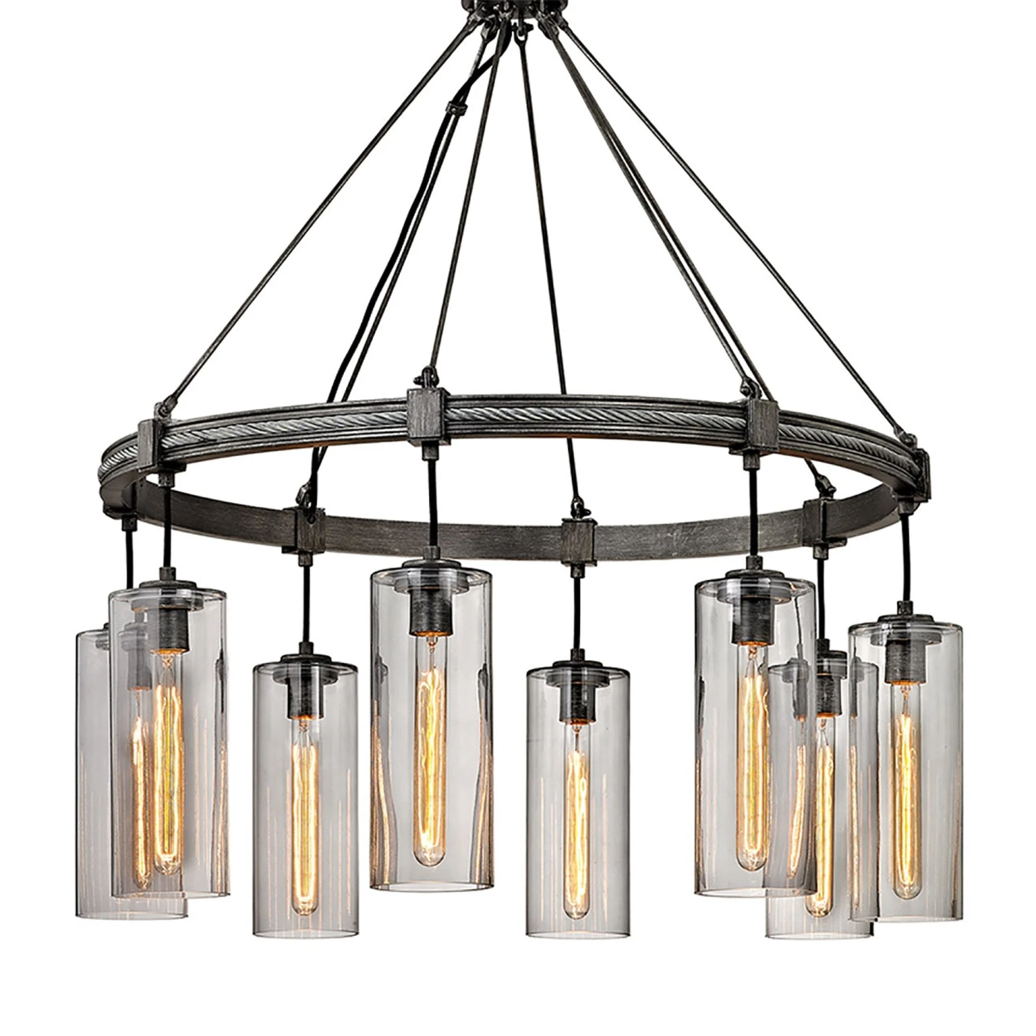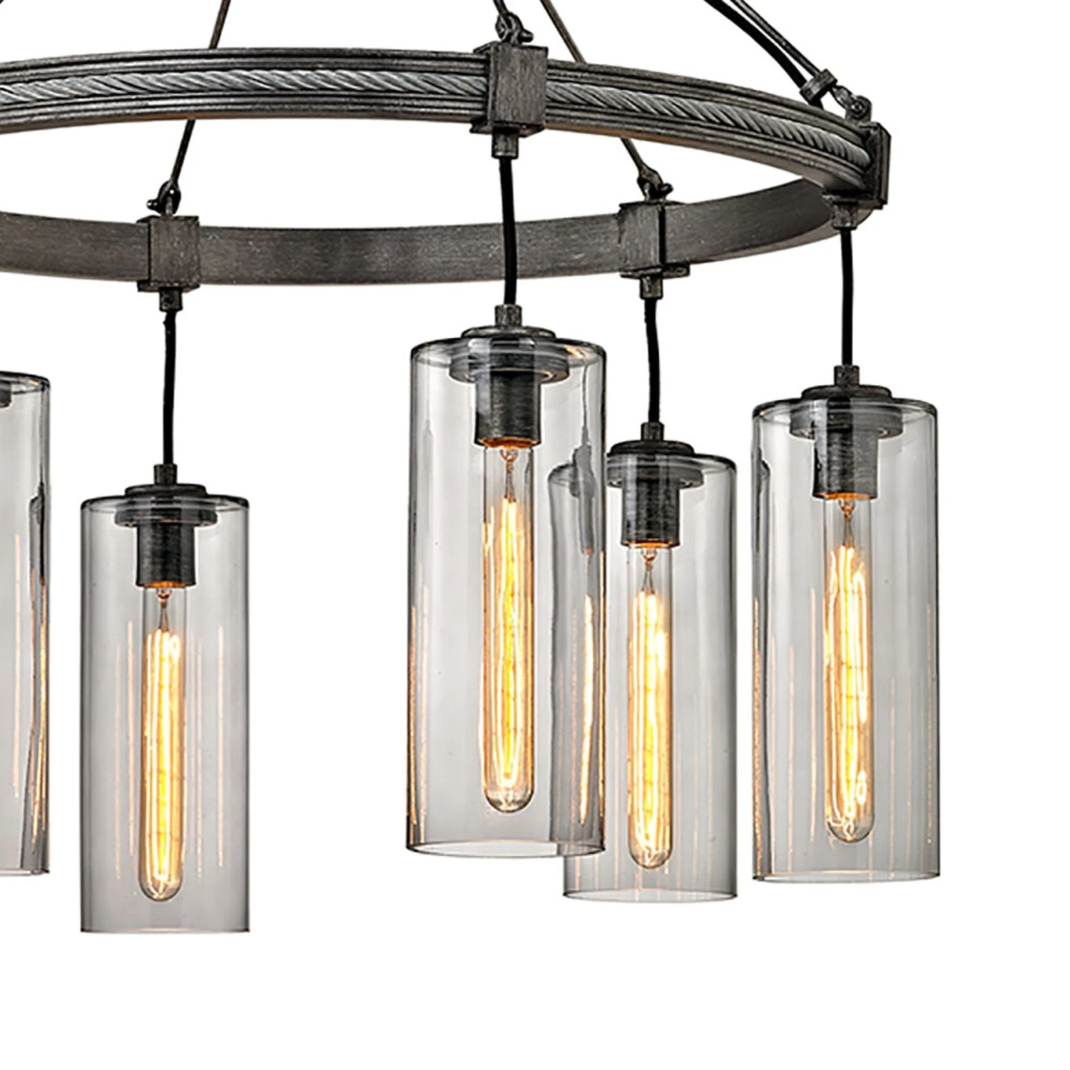 Tubular bulbs glow from within smoky glass hurricanes to emphasize the industrial underpinnings of this graphite finish Union Square Chandelier from Troy Lighting.