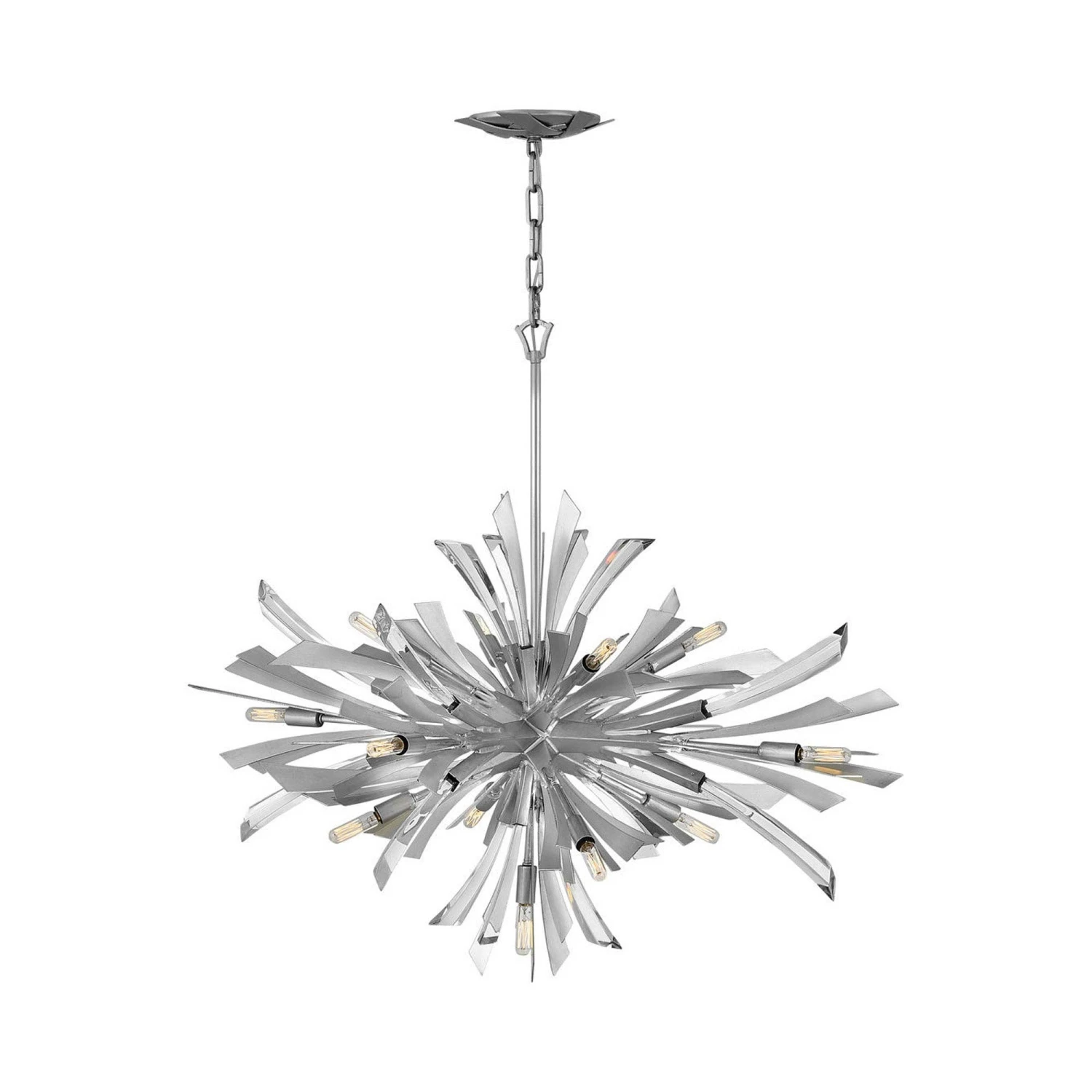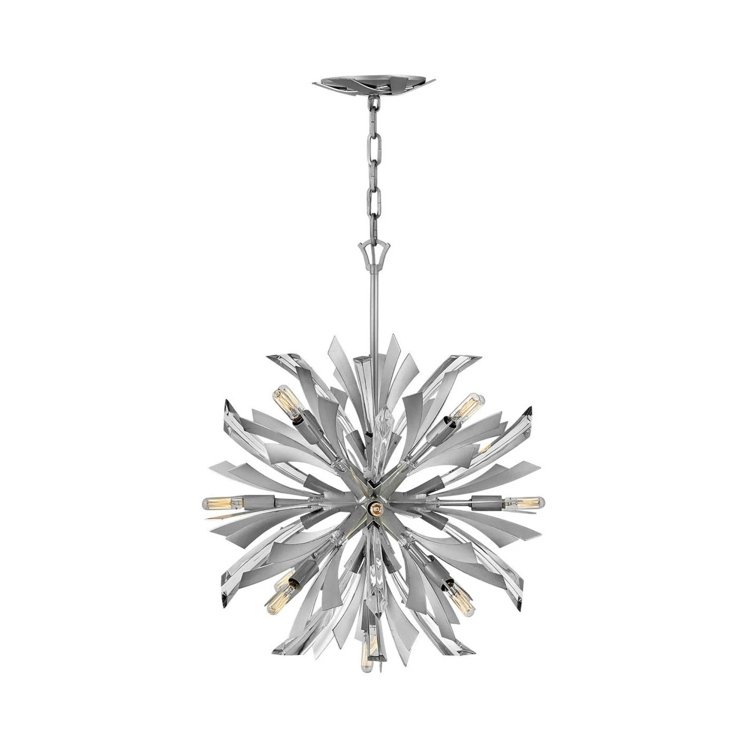 Vida’s modern design bursts with a flourishing style that is both highly dramatic and finely sculpted. A statement piece with crystal accents and unique canopy detailing, Vida injects a thrilling dash of contemporary inspiration to its surroundings in a burnished gold or glacial finish.