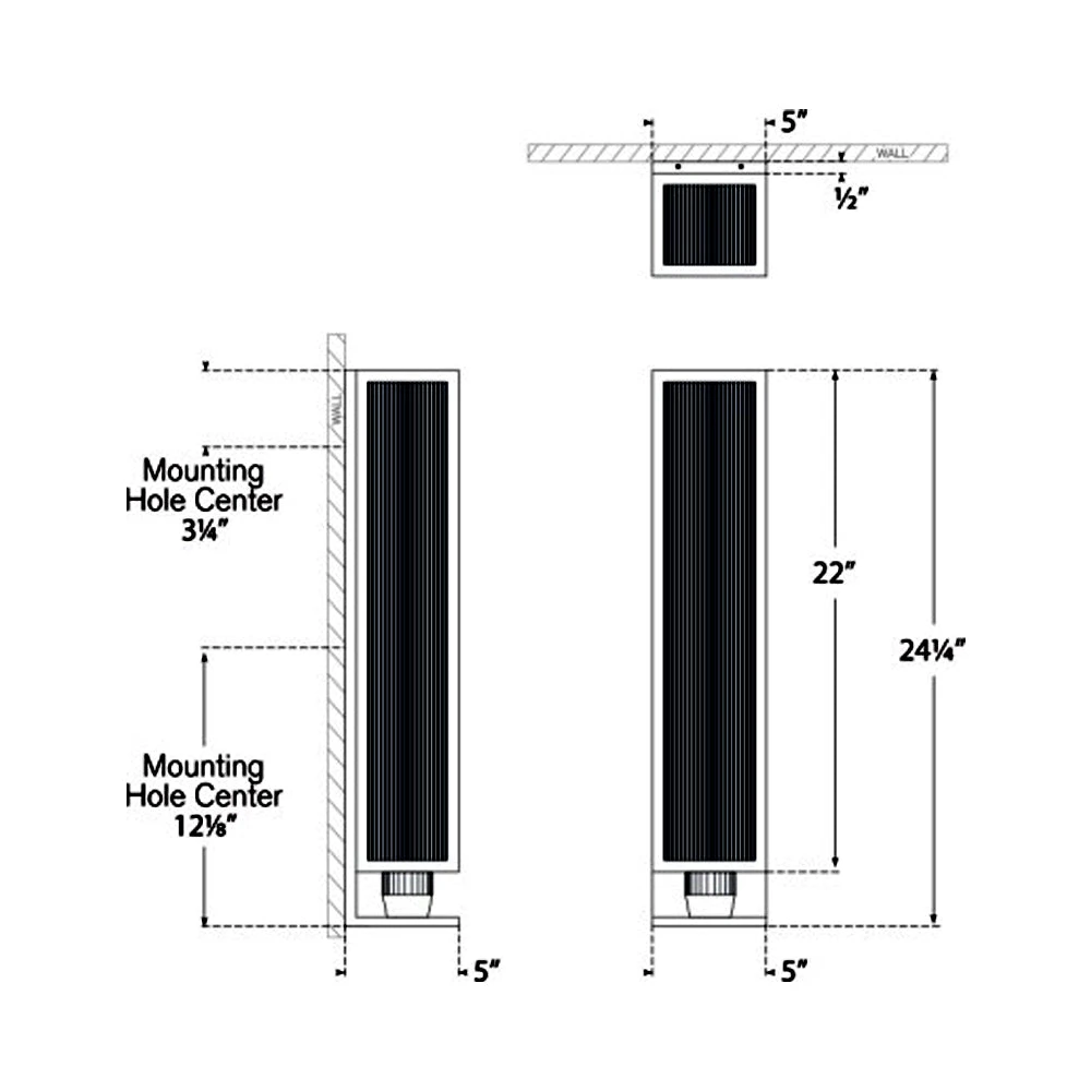 - 1-Light: 5″W X 24.25″H; 5″ Extension