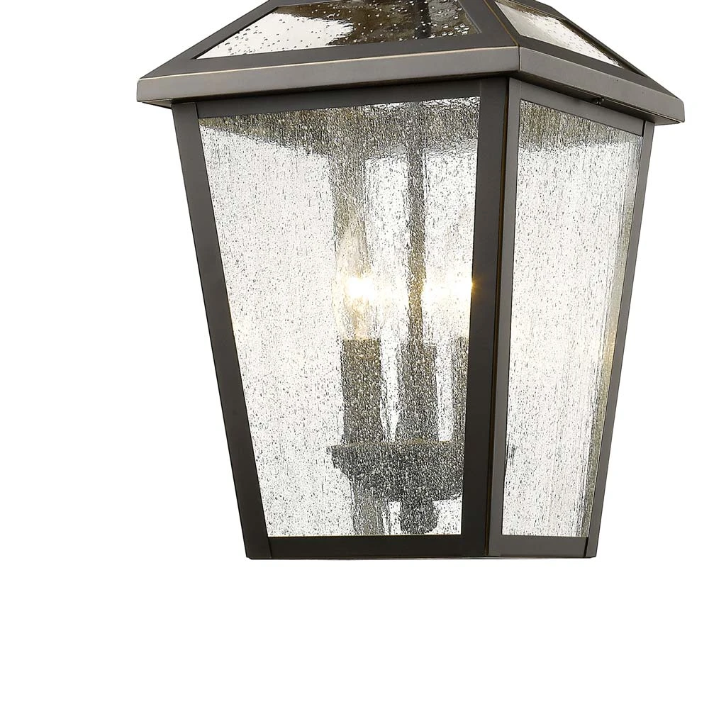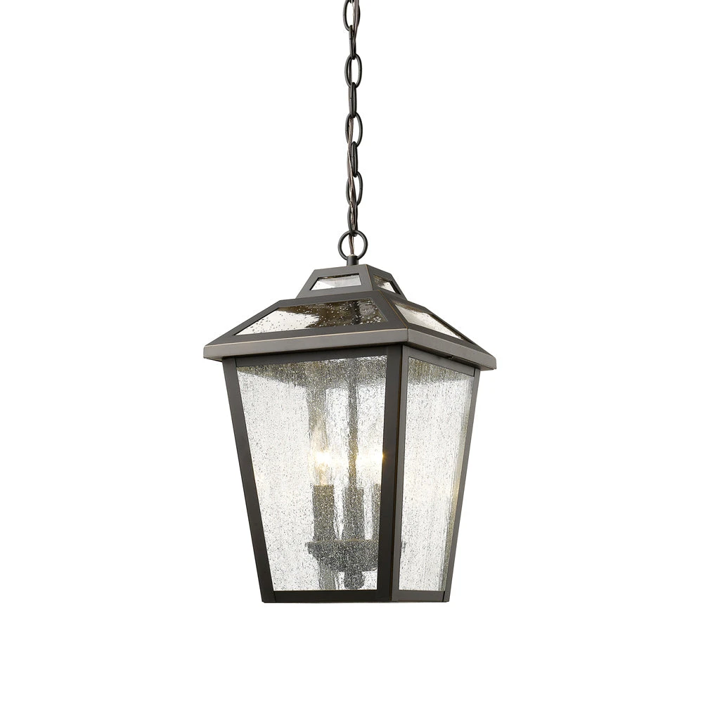 Turn up the charm in an exterior space with the Bayland Outdoor Pendant Light from Z-Lite. Its timeless lantern motif earns intriguing geometric elements, with oil rubbed bronze tapered aluminum and heady clear seedy glass panels hinting at a vintage maritime aesthetic. Lighting glows from timeless candelabra mounts that embellish the romantic flavor of a classic.