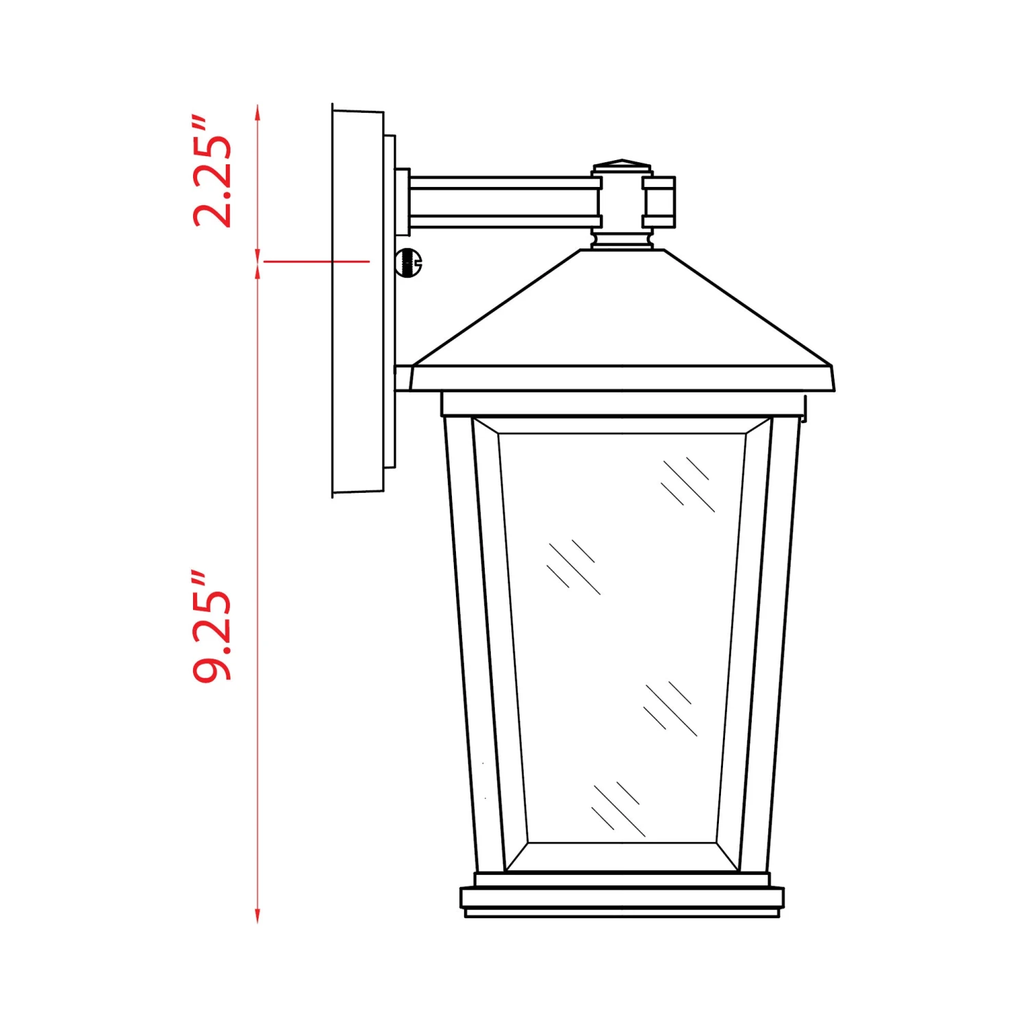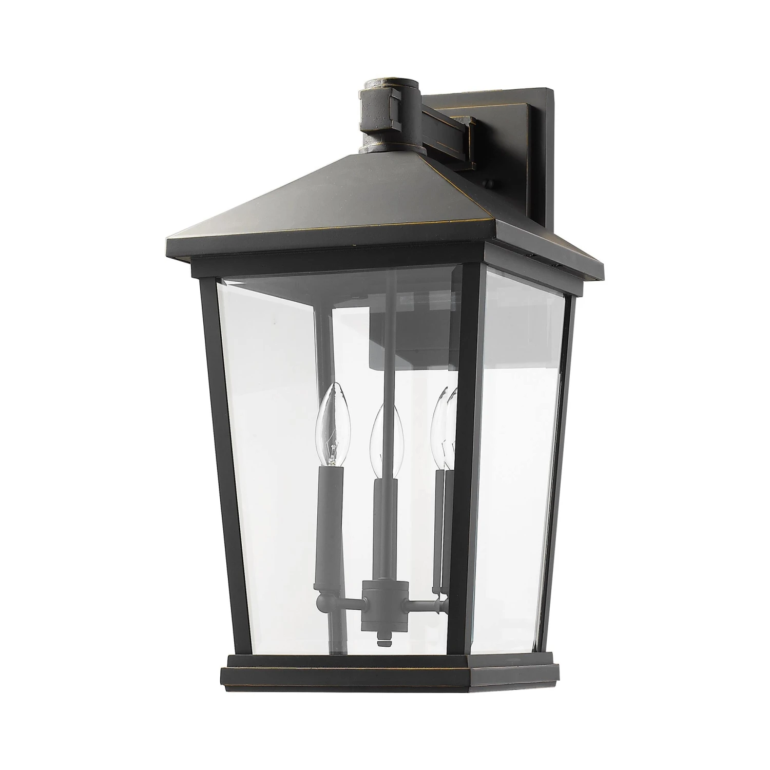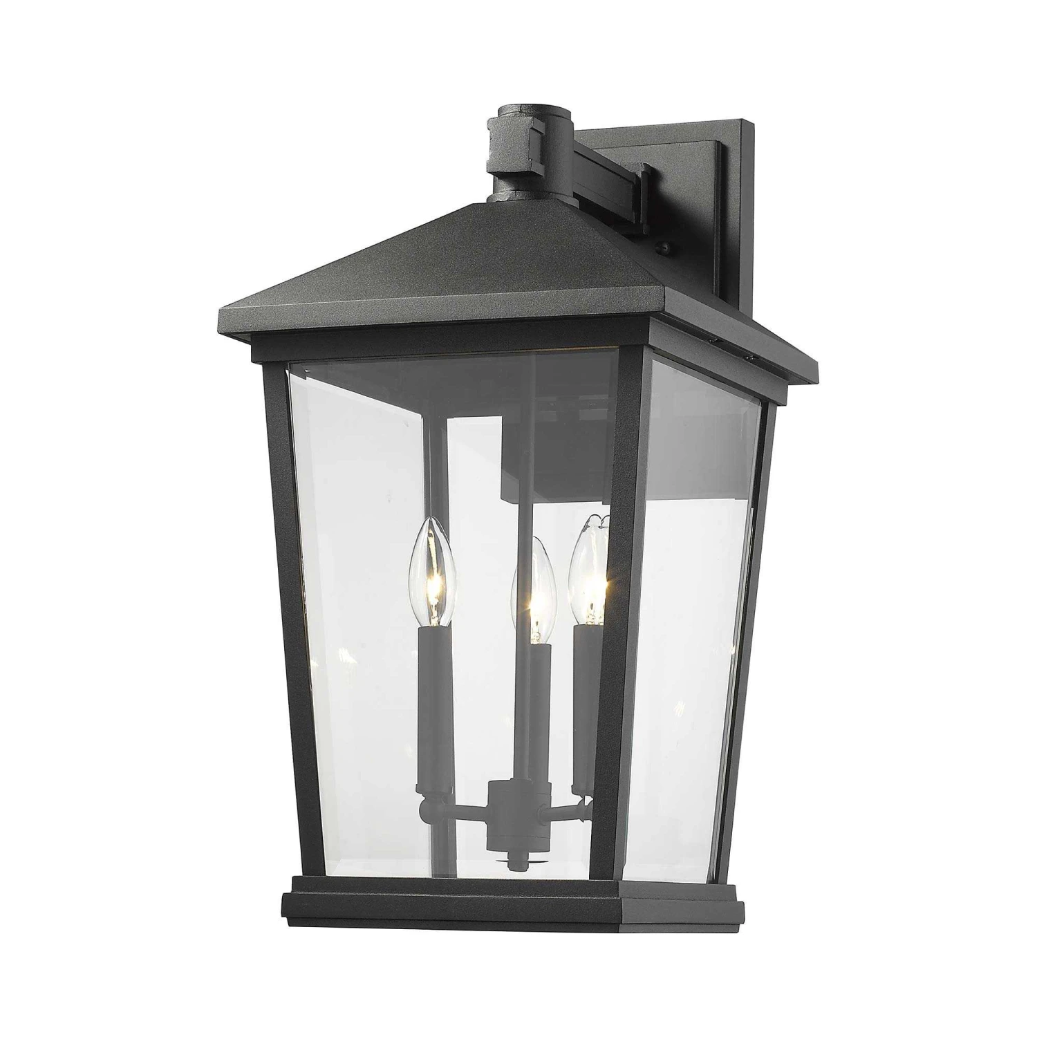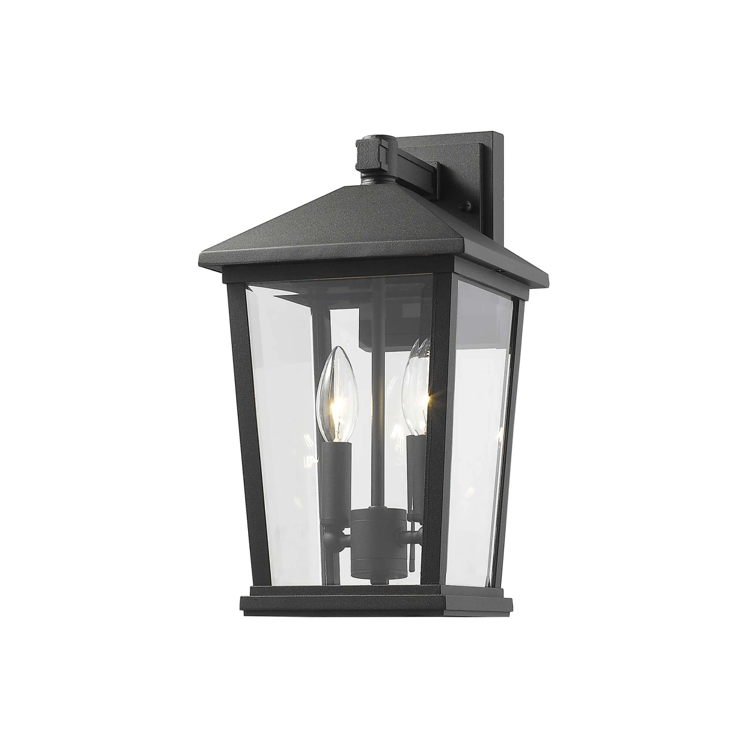 The appearance of simplicity translates to an updated lantern motif as the Beacon Outdoor Wall Light from Z-Lite flatters both commercial and residential structures. Aluminum framing creates a tapered silhouette topped with a peaked roof, as clear beveled glass panels cover romantic candelabra-style lighting.
