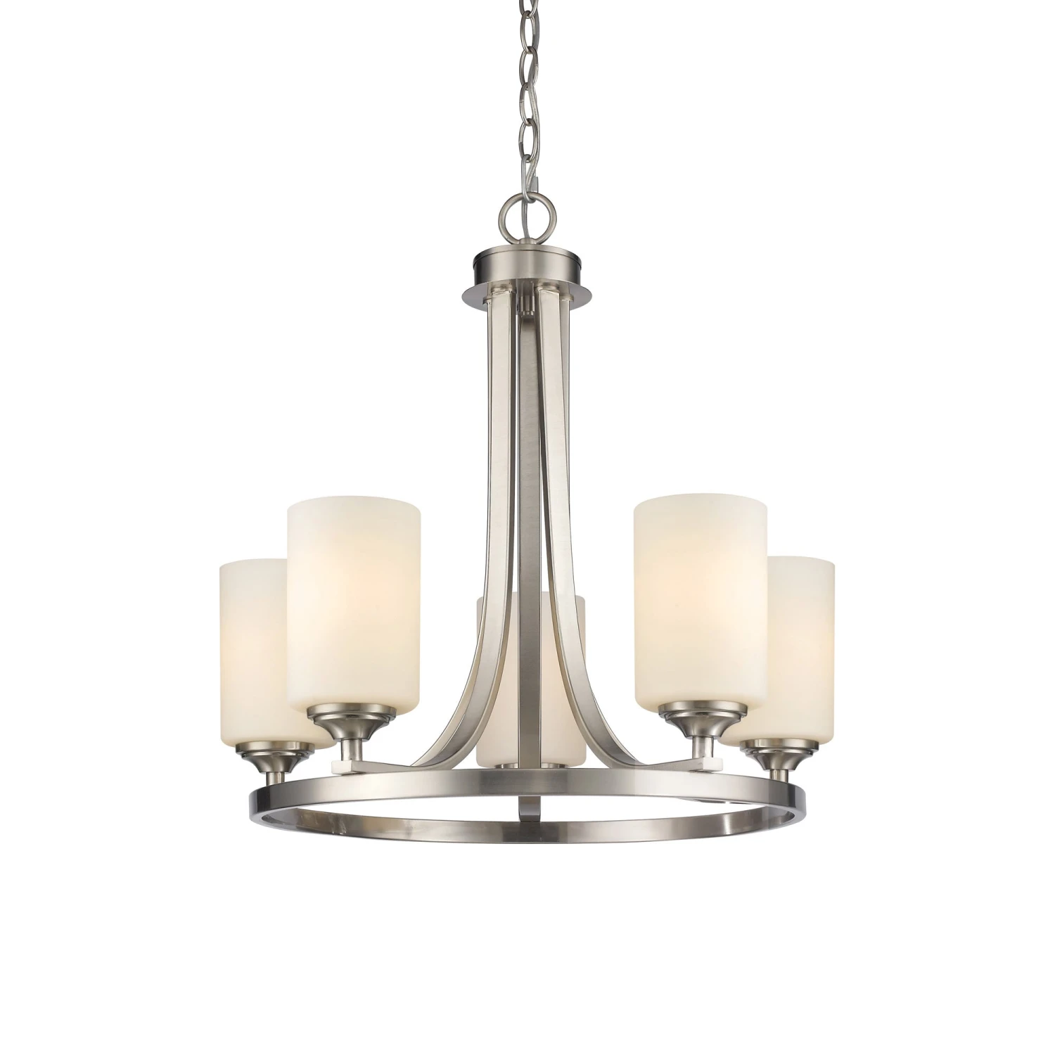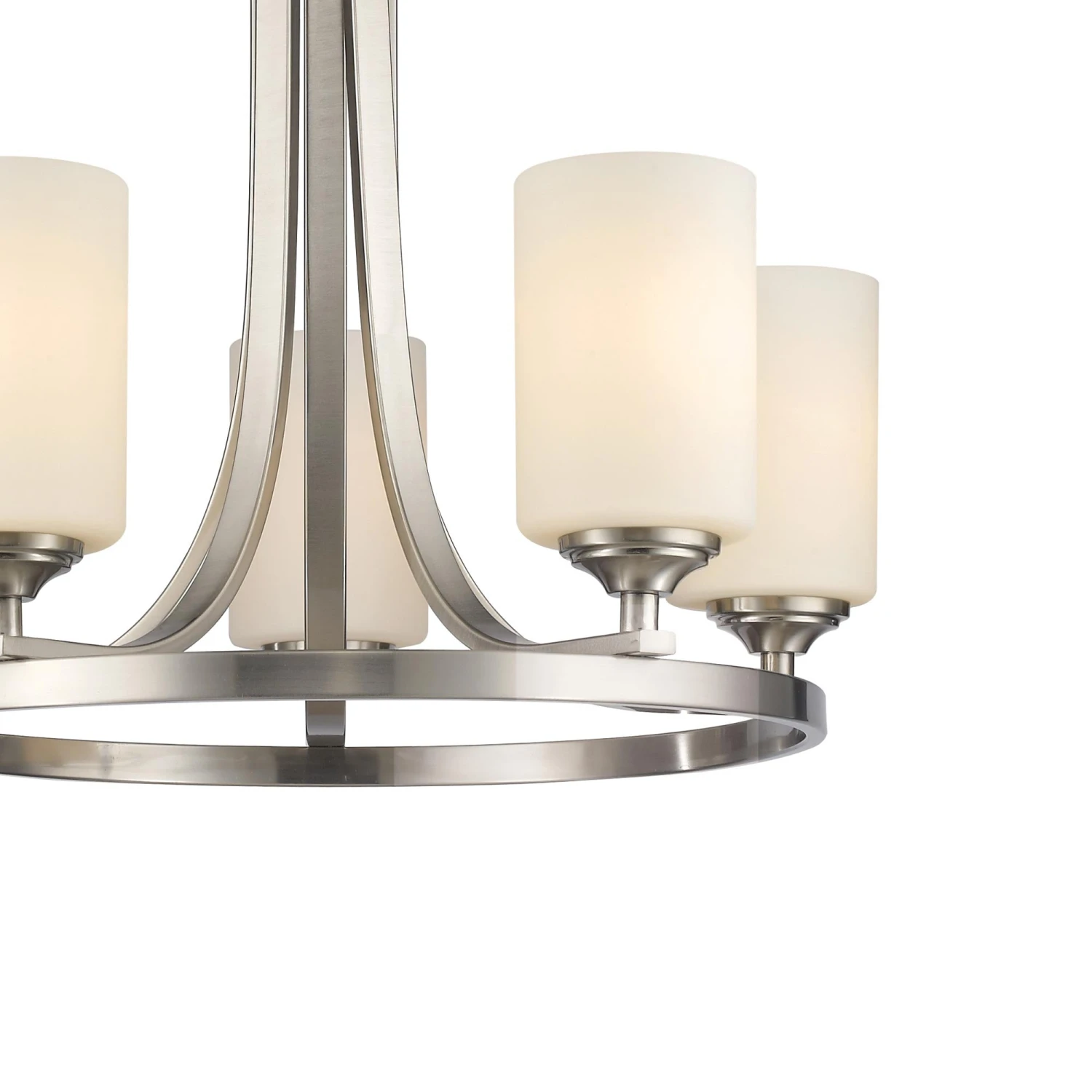 The Bordeaux Chandelier from Z-Lite delivers a cherished mix of old and new as it highlights a dining space or foyer. Thick bands of steel and an open ring frame create a striking element that captures attention. Matte opal glass cylinder shades put finishing touches on a versatile yet elegant ambiance.
