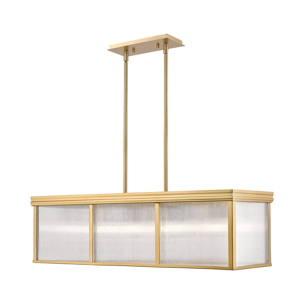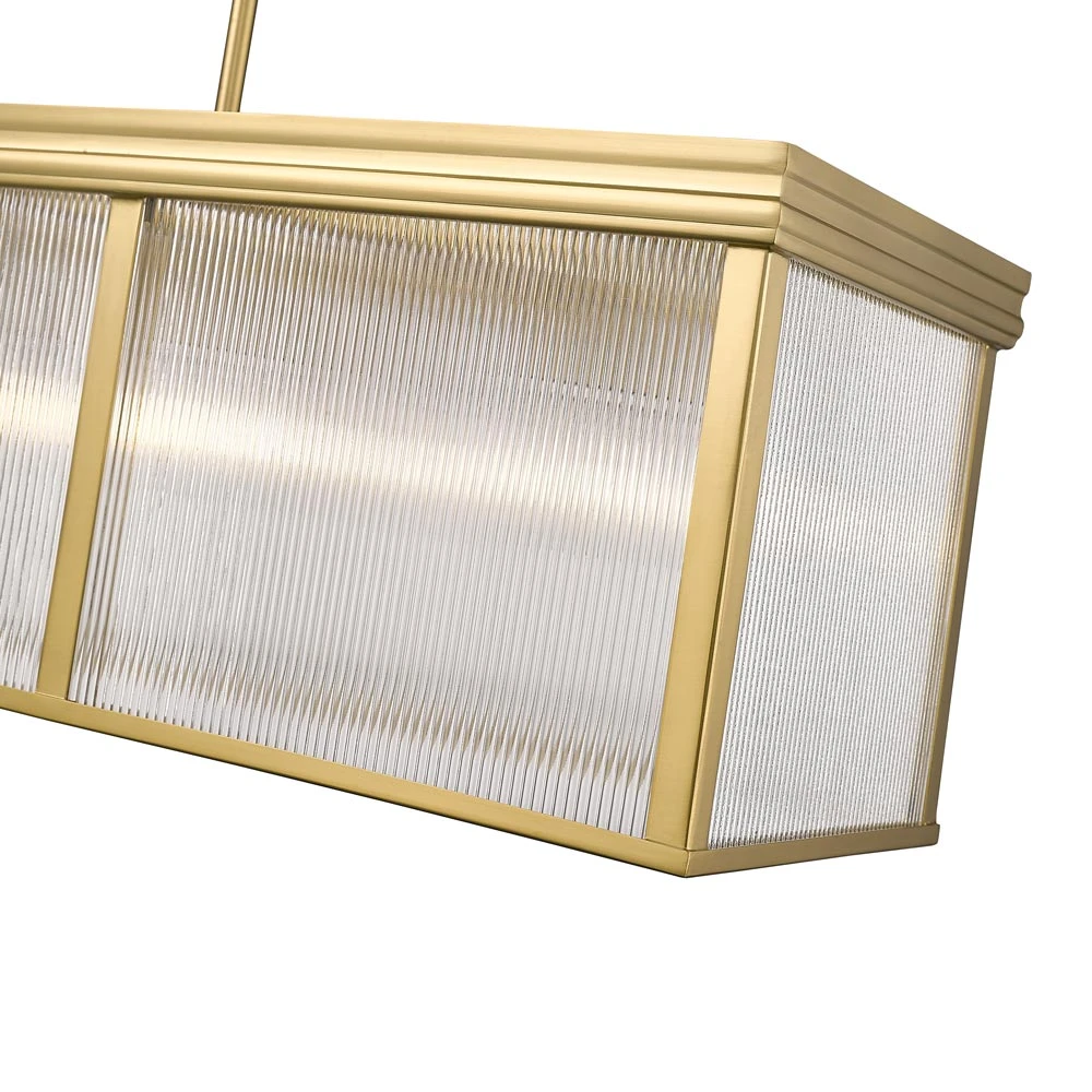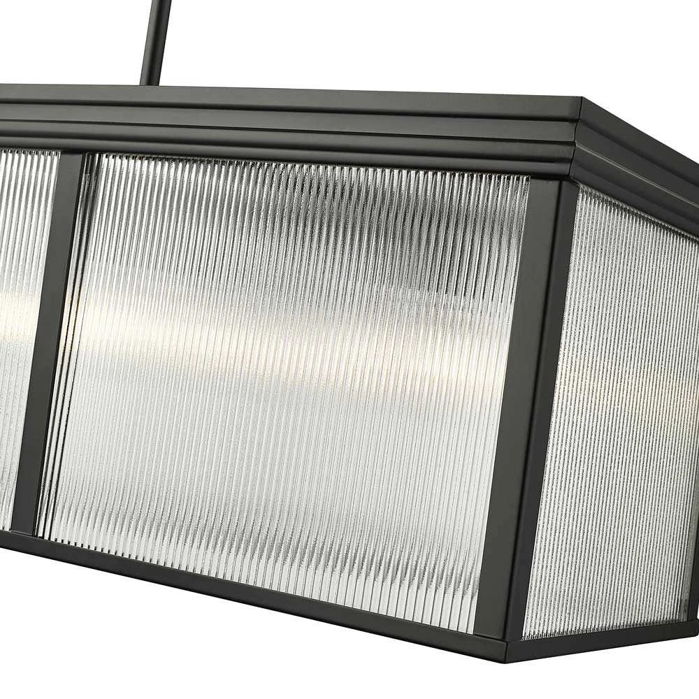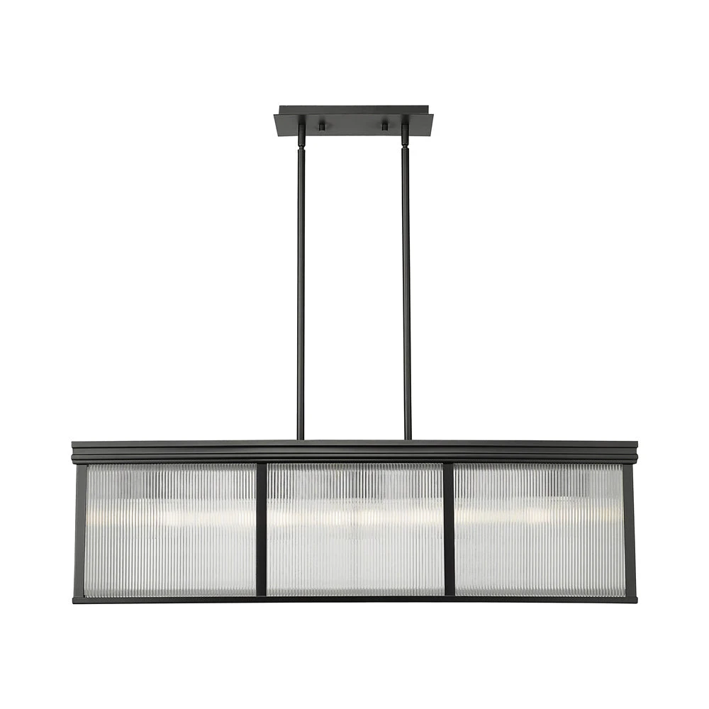 Panes of clear ribbed glass bring striking texture and depth to the Carnaby Linear Chandelier from Z-Lite. Perfect over a kitchen island or rectangular dining table, it delivers soft, inviting illumination and is dimmable for custom ambiance within your space.