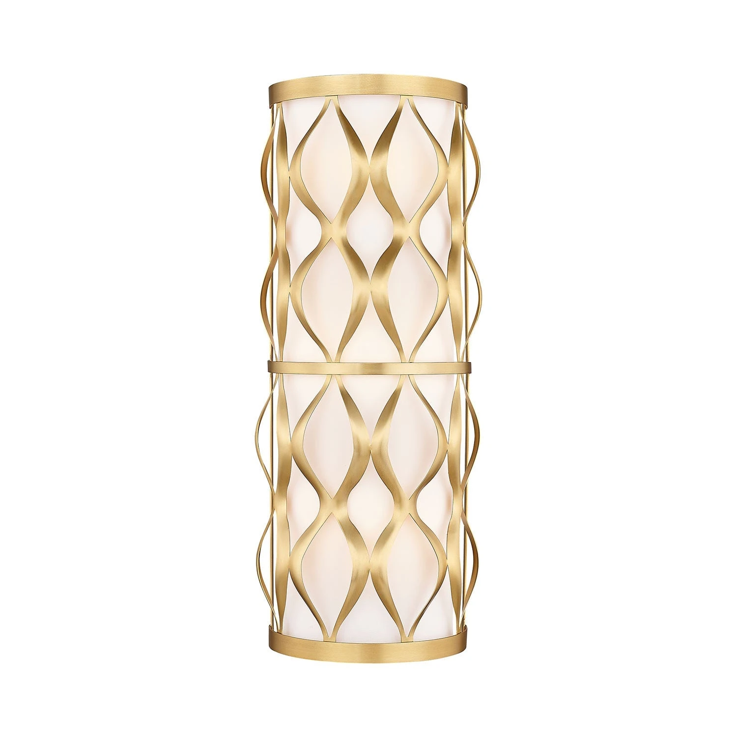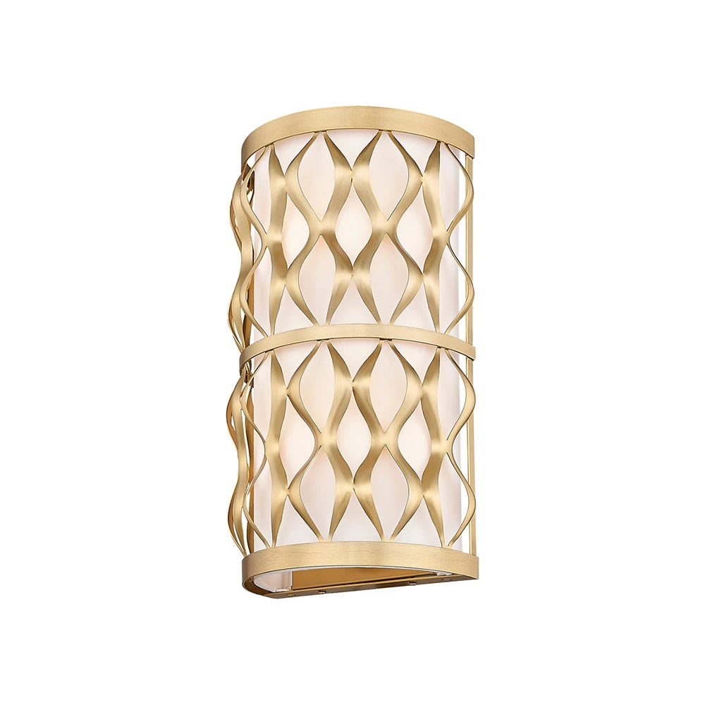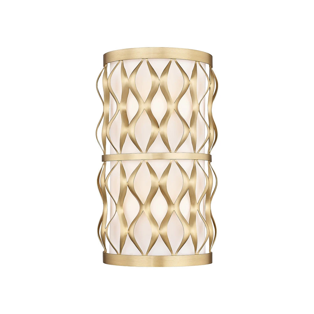 Indulgent dimensionality and vintage beauty await a transitional venue as the Harden Wall Light from Z-Lite delivers an impressive look. A half-round steel frame with decadent ribbon patterning and binding strips shelters a white fabric shade filtering light spectacularly. Make this wall light a statement in a low-key casual space.
