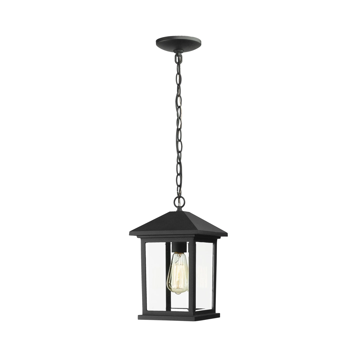 Aluminum construction is weather-resistant and chic, complementing the Portland Outdoor Pendant Light from Z-Lite. With a classic lantern motif, this romantic fixture adds a dimensional roof and linear panels, with clear beveled glass offering full view of an interior light. Embrace this iconic fixture in a covered deck or porch.
