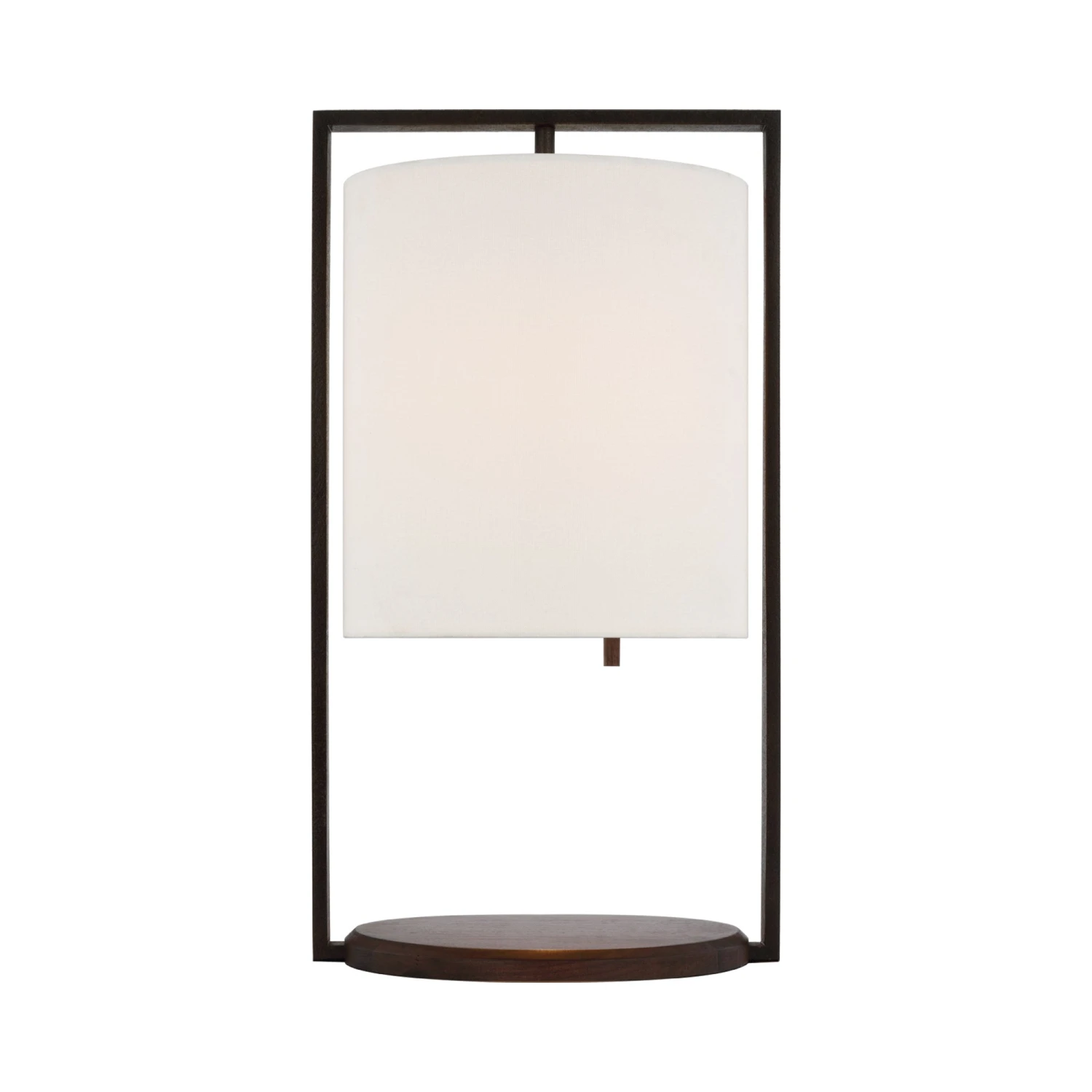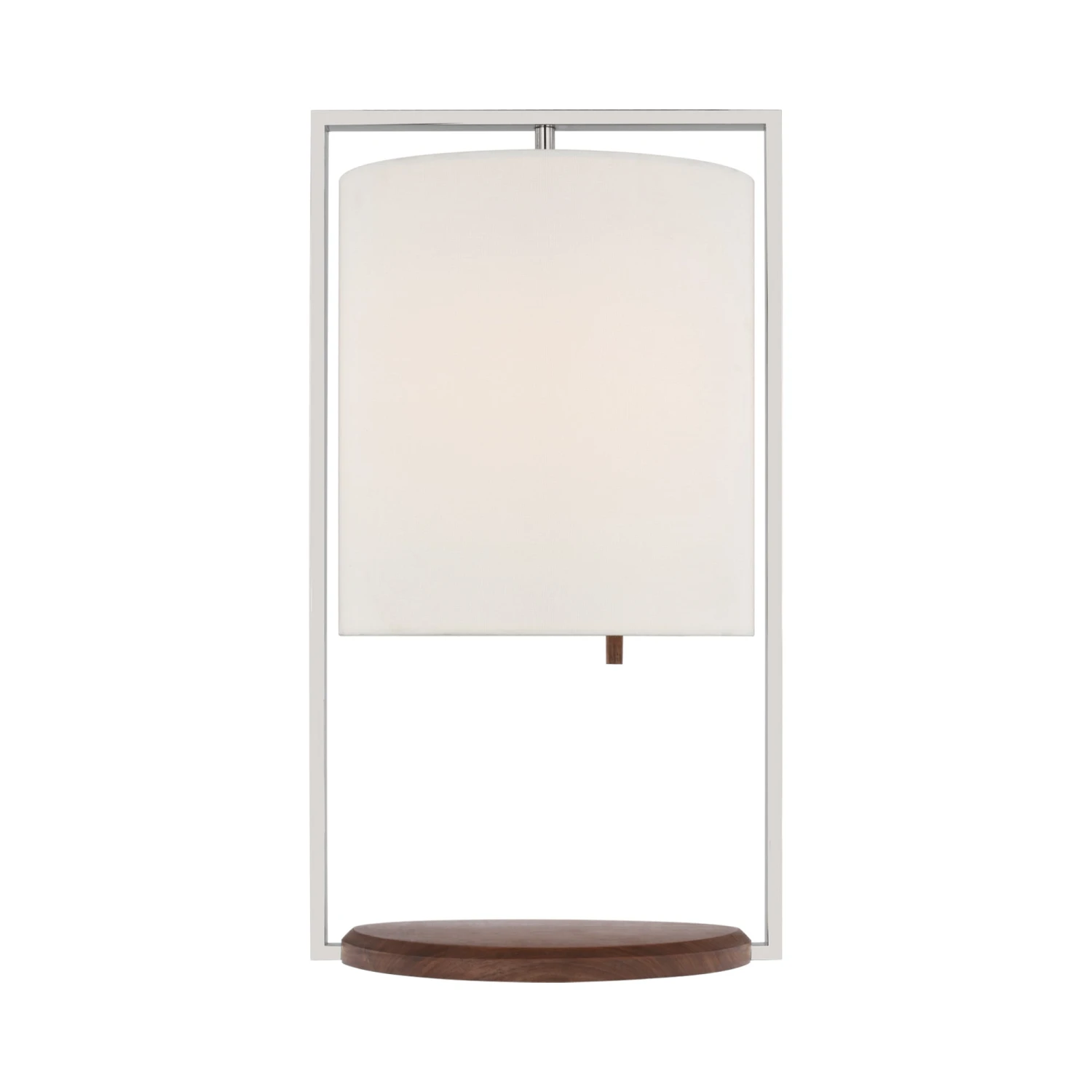 A drum seems to float within the open frame of the impeccable Zenz Table Lamp from Visual Comfort Signature. Its white linen casts bright, direct illumination for inviting ambiance. The minimalist frame of the lamp sets the tone, with a metallic finish that contrasts beautifully against a walnut finish wooden base that brings organic flair.