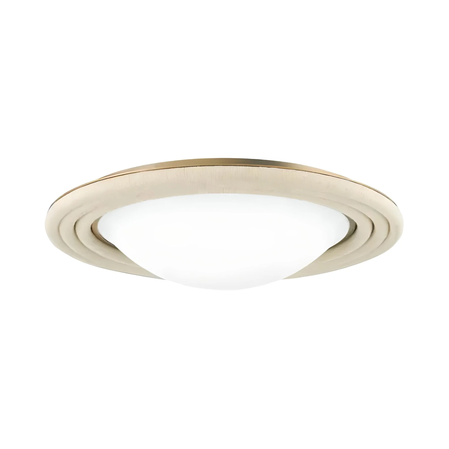 Whimsical style centers on a festive aesthetic as the Zion LED Flush Mount Ceiling Light from Troy Lighting becomes the center of attention in a contemporary living space. Natural intrigue follows concentric circles made of white cotton rope that surrounds a sleek opal matte shade, offering an interestingly glam version of coastal casual. This irreplaceable ceiling light sends energy-efficient lighting around a kitchen, hallway, or entryway.