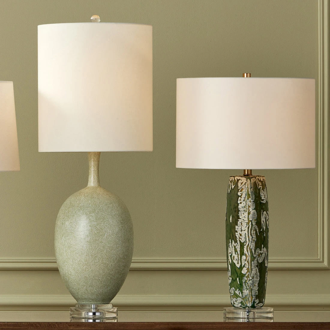 Abstract meets quirky in a light source with ultimate elegance. The Zowan Table Lamp from Currey and Company hints at deco style with a gently shaped green and cream ceramic body offering exotic patterning. An optic crystal base and eggshell cotton shade shift focus to an alluring columnar body that changes when viewed from different angles.